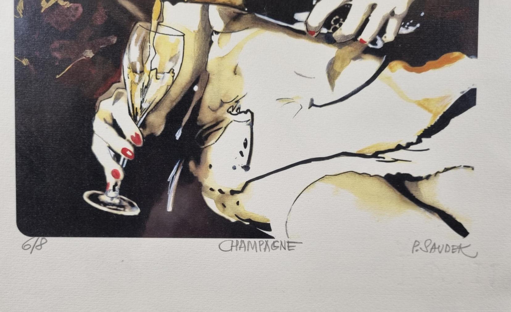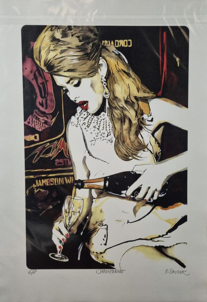 Prohlednout celou aukciGrafika od Patrika Saudka s názvem Champagne. V díle vidíme ženu s láhví šampusu, je slavnostně oblečená a obklopují ji barové plakáty. Saudkovým námětem se nejčasteji stává žena v různých situacích a podobách. Gicleé tisk na volně loženém papíře z Losin, rozměry papíru 43 x 29 cm, rozměry tiskové plochy 34 x 23 cm. Signováno vpravo dole "P. Saudek", tisk 6/8, uprostřed název díla.