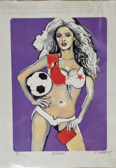 Prohlednout celou aukciDílo od autora Patrika Saudka je silně ovlivněno tvorbou jeho otce, mísí se v něm komiksová stylizace a pop-artová barevnost s náměty, které většinou vyzdvihují ženu a její fyzické přednosti. V tomto díle v centru vytváří ženu se znakem fotbalového týmu Slavie na prádle, která drží míč a červenou kartu. Gicleé tisk na volně loženém papíře z Losin, rozměr díla 43 x 30 cm, rozměr tiskové plochy 34 x 24 cm. Signováno vpravo dole P. Saudek", výtisk 6/8.