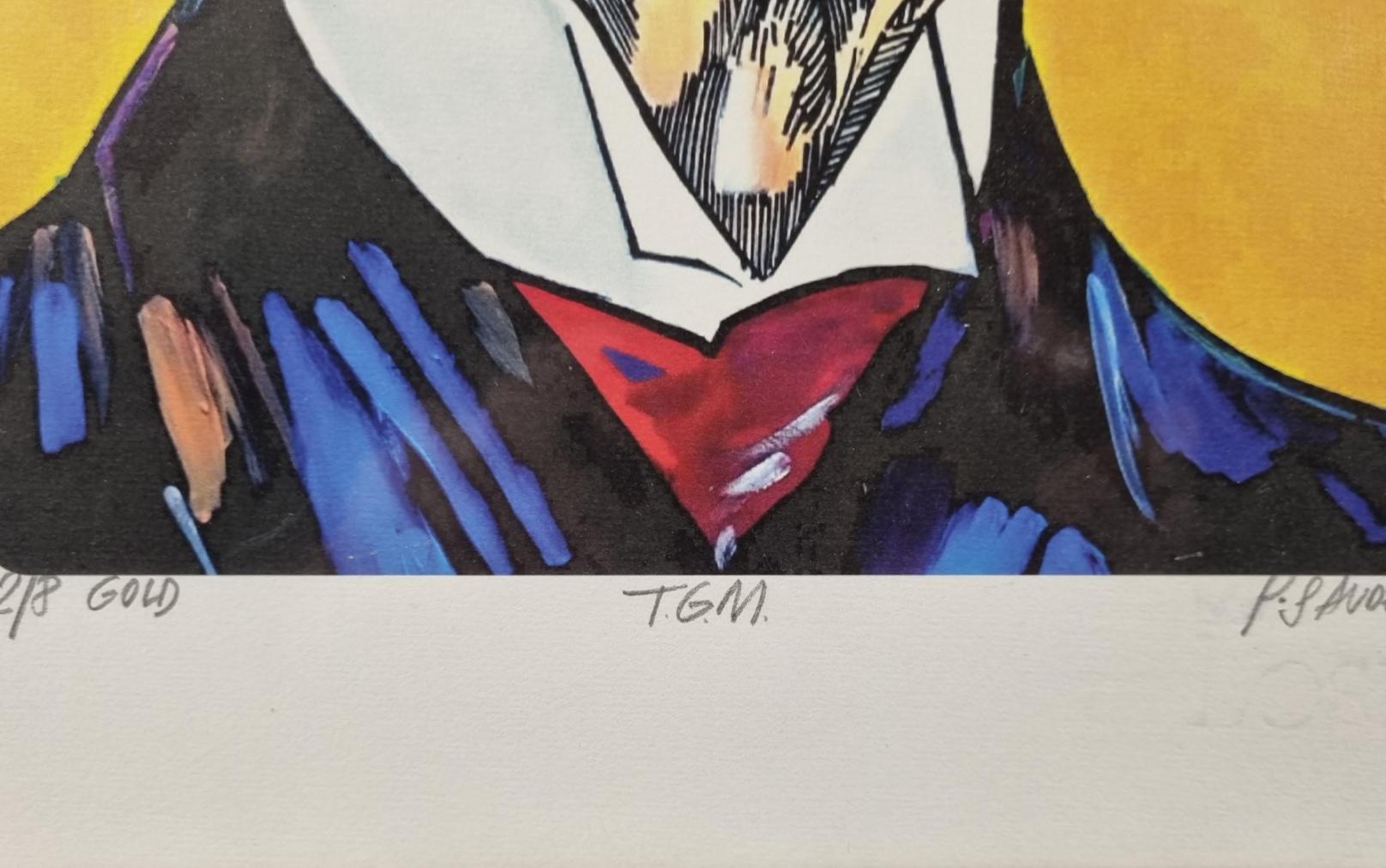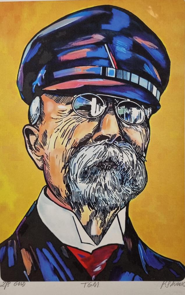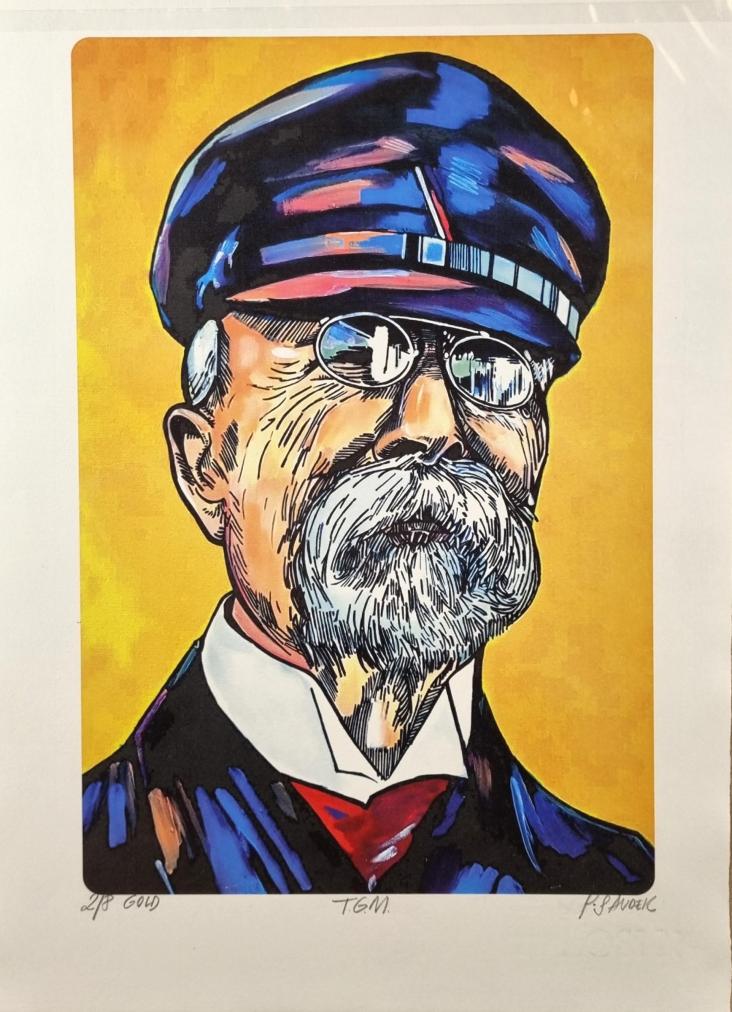 Prohlednout celou aukciGrafika od Patrika Saudka s námětem T. G. Masaryka. Umělec čerpá inspiraci od svého otce, Káji Saudka, jeho díla podléhají komiksové vizualitě, která se snoubí s lehce pop-artovým zpracováním. Gicleé tisk na volně loženém papíře z Losin, rozměry papíru 43 x 30 cm, rozměry tiskové plochy 34 x 23 cm. Signováno dole "P. Saudek", výtisk 2/8 gold, T. G. M."