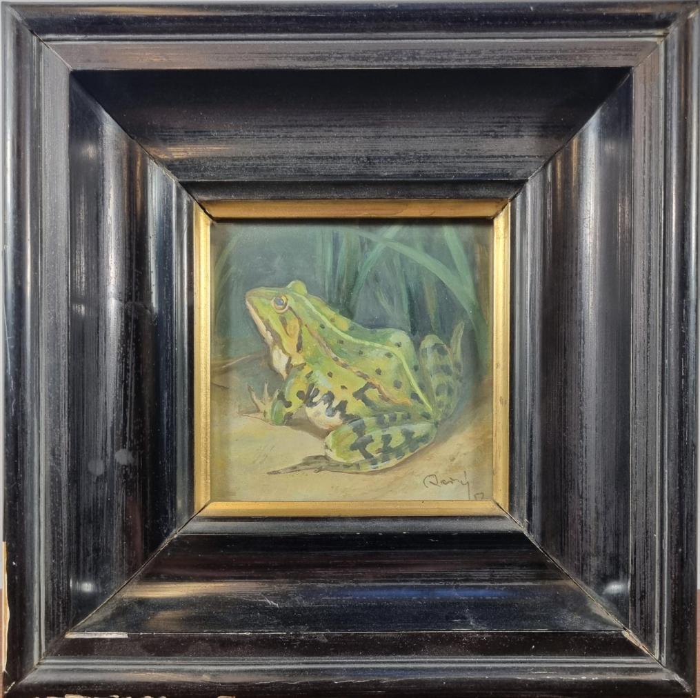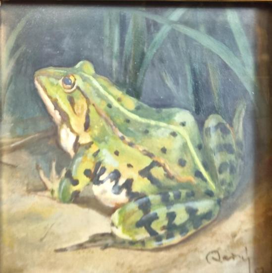 Prohlednout celou aukciSkvělá malba s námětem žáby v krajině. Umělec realisticky zachycuje tělo skokana se všemi jeho skvrnami a odstíny, skokan sedí zády a ukazuje svojí barevnou kůži a kolem jsou stébla trávy. Jednoduchost náměstu se snoubí s formální stránkou obrazu, je zasazen do masivního černého rámu, který obraz povznáší. Olej na kartonu nebo papíře, rámováno, rozměry s rámem 25 x 25 cm, rozměry díla 11 x 11 cm. Signováno vpravo dole - neznáme.