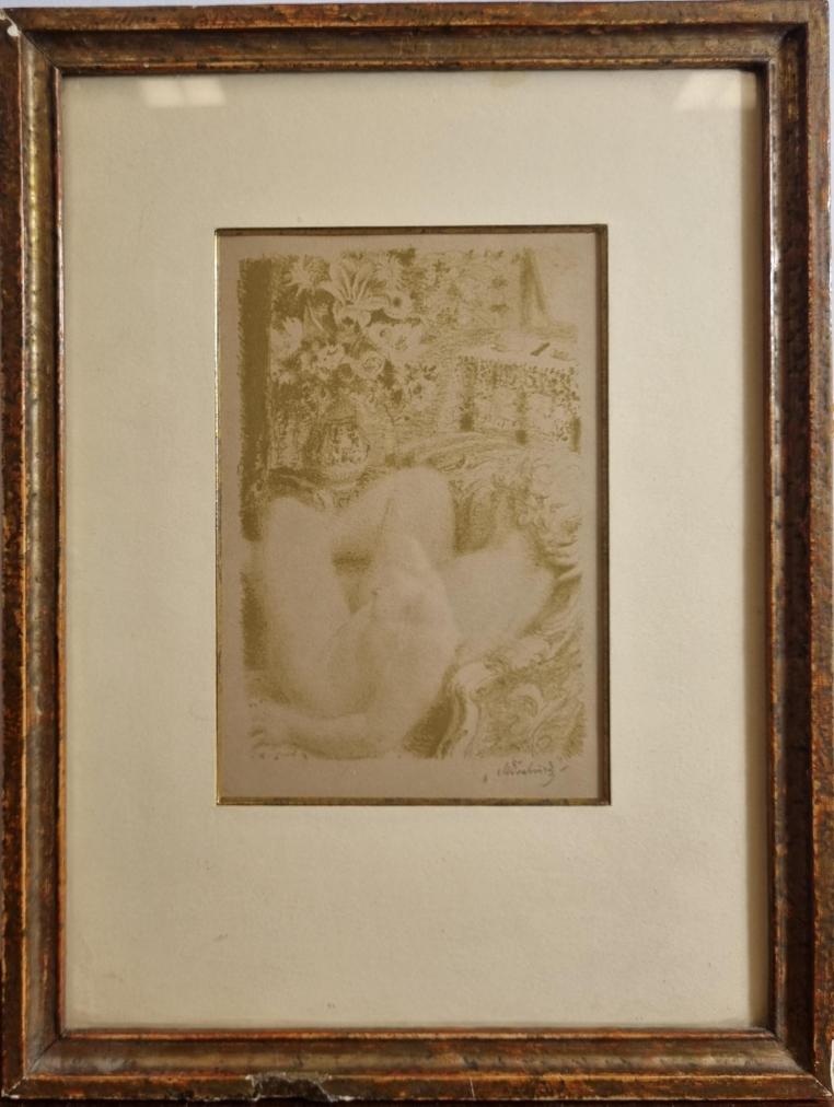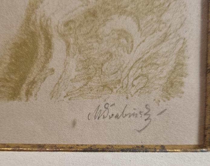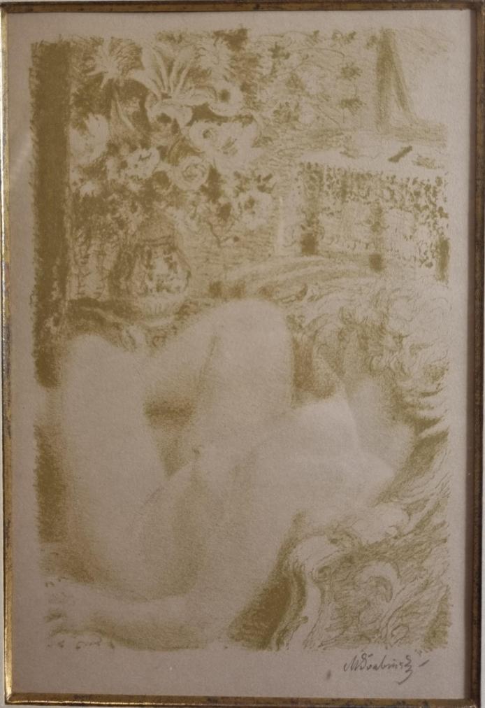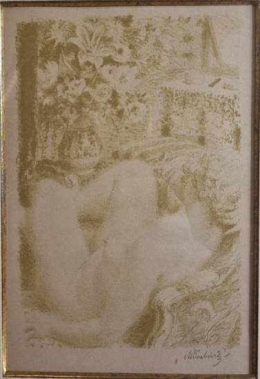Prohlednout celou aukciGrafika od Maxe Švabinského v jemně zelených tónech. Autor pracuje s čistými plochami bez barvy, tyto plochy ohraničuje tím, co je v obklopení a vytváří tak obrácený princip kresby. Osvětlená místa nechává bez zásahů a jediné, co definuje, jsou stinná místa. Litografie na papíře, rámováno pod sklem, rozměry s rámem 36 x 27 cm, rozměry díla 17 x 12 cm. Signováno vpravo dole "M. Švabinský". Vzadu text "Prof. Max Švabinský "Spící nahá žena v lenošce", kresba na kameni z r. 1933".