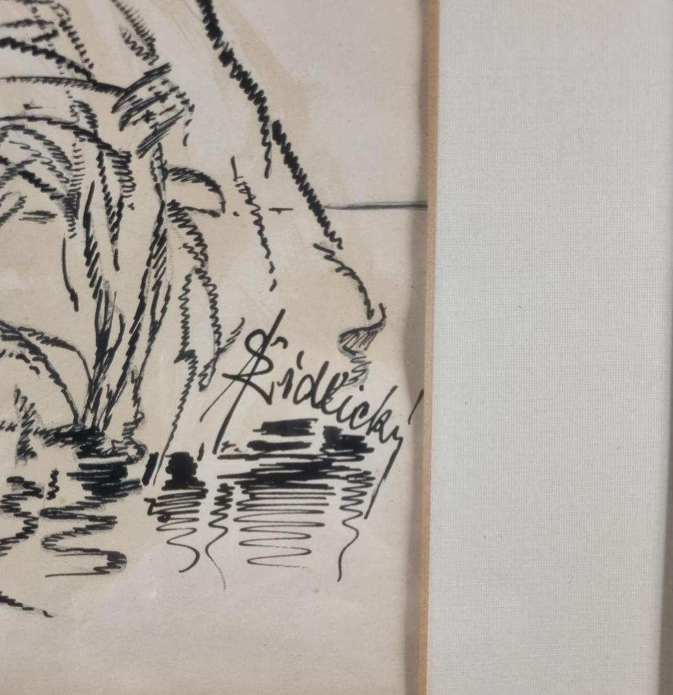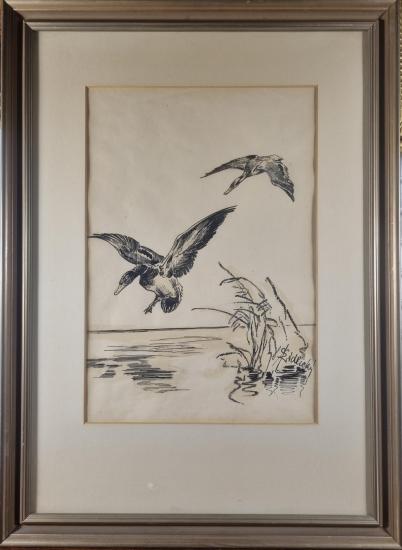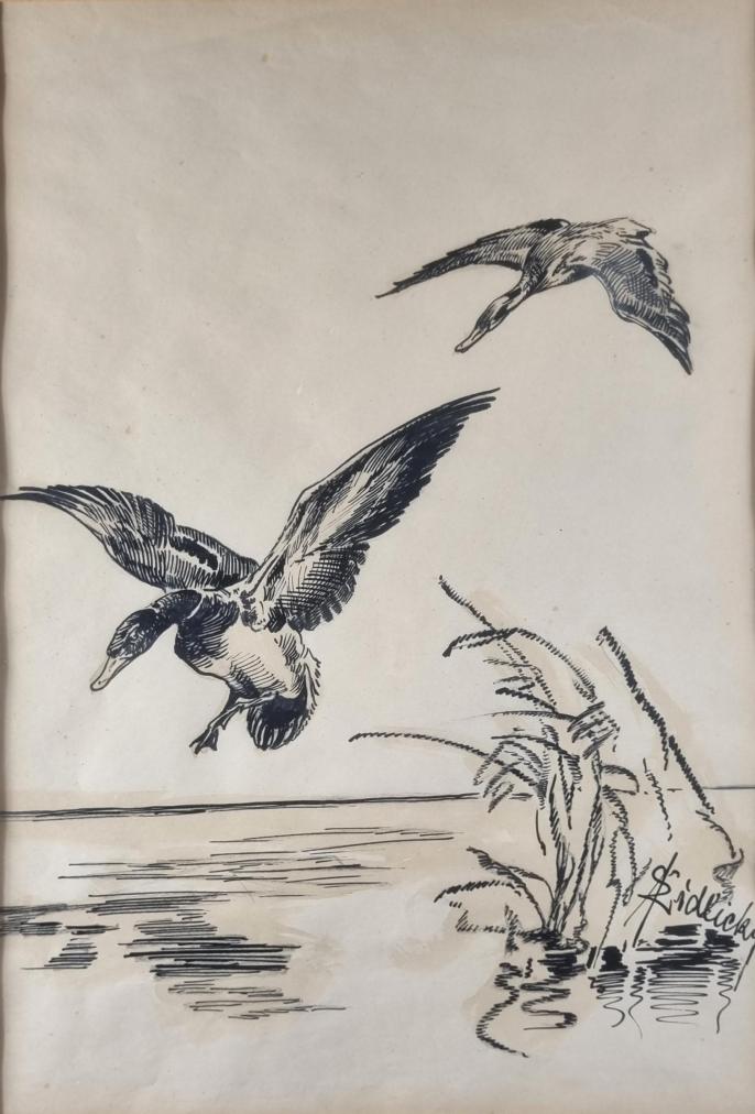 Prohlednout celou aukciPěkná, jednoduchá perokresba od autora Židlického, jehož častým námětem byla krajina a její fauna. V tomto díle naznačuje jednoduchými tahy hladinu rybníku, na kterou přistávají kachna a kačer. Prostřednictvím kombinací šrafur dosahuje realistického efektu, motivy podmaloval lehce tmavším odstínem a tak je zvýraznil. Kombinovaná technika na papíře, rámováno pod sklem, rozměry s rámem 61 x 44 cm, rozměry díla 38 x 26 cm. Signováno vpravo ve spodní části obrazu "Židlický".