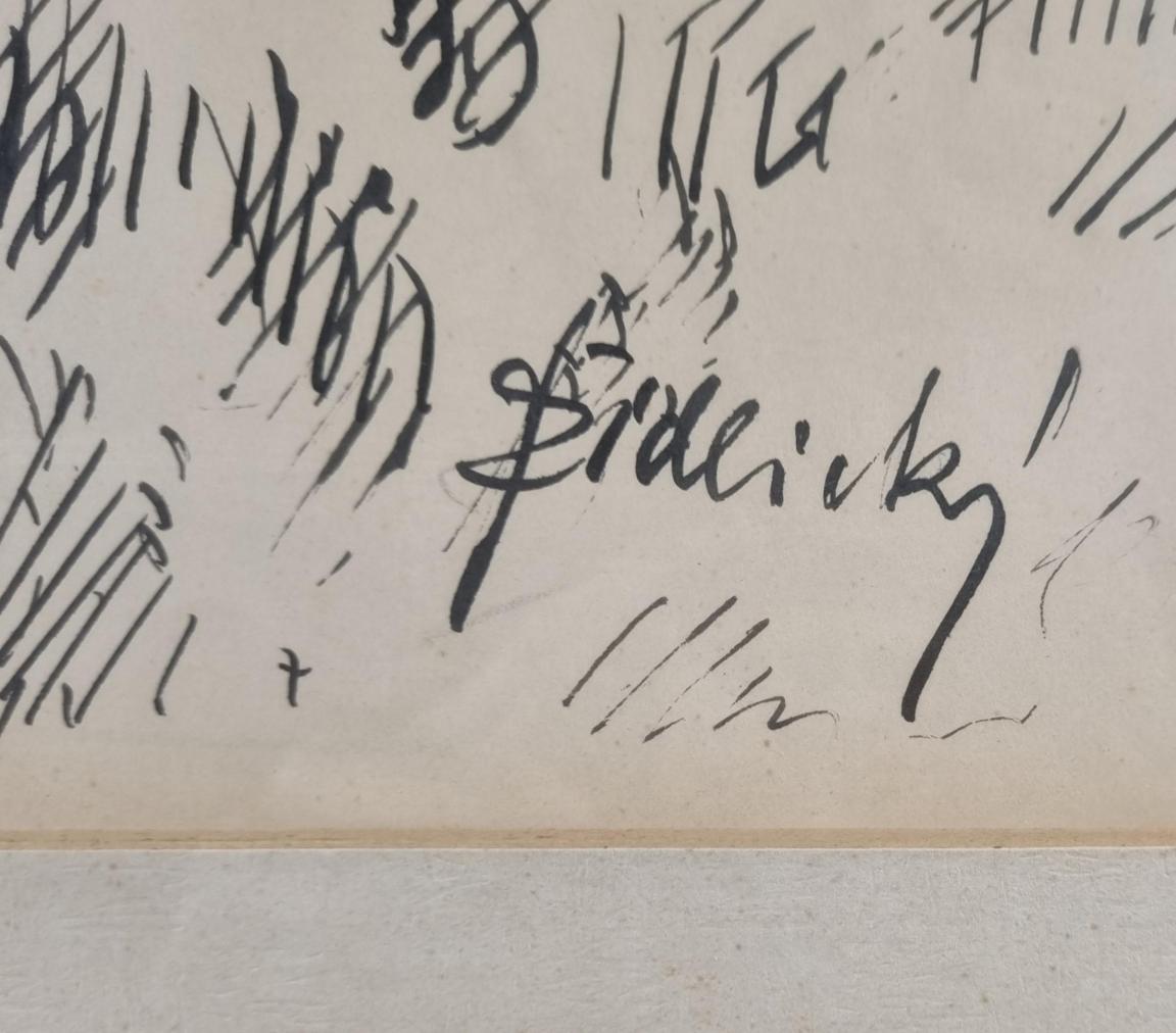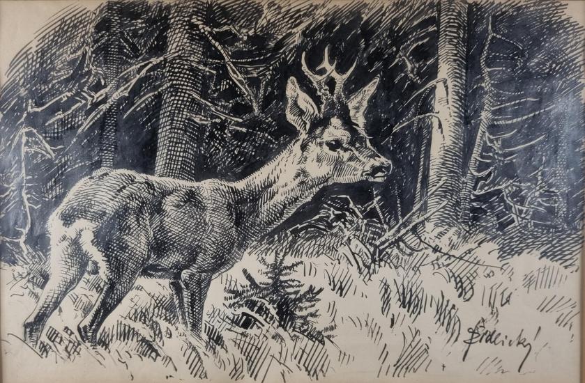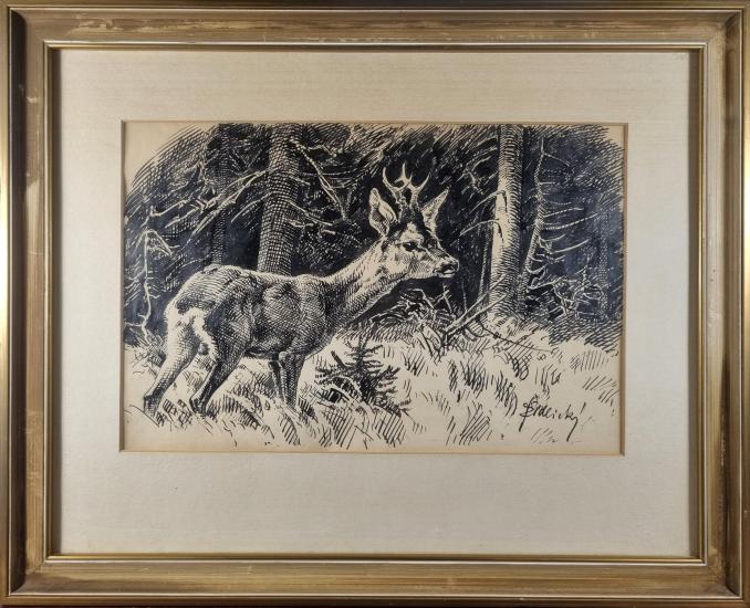 Prohlednout celou aukciTypické dílo od Jiřího Židlického. Hustou šrafurou vytváří hluboký les, který se rozprostírá za srncem, díky tmavému podkladu vyniká tělo srnce v jeho plné kráse. Zvíře stojí poklidně v trávě a pod sebou má mladý smrk. Pod perokresbou místy prosvítá náčrt tužkou. Perokresba na papíře, rámováno pod sklem, rozměry s rámem 61 x 49 cm, rozměry díla 42 x 28 cm. Signováno vpravo dole "Židlický".