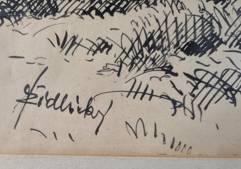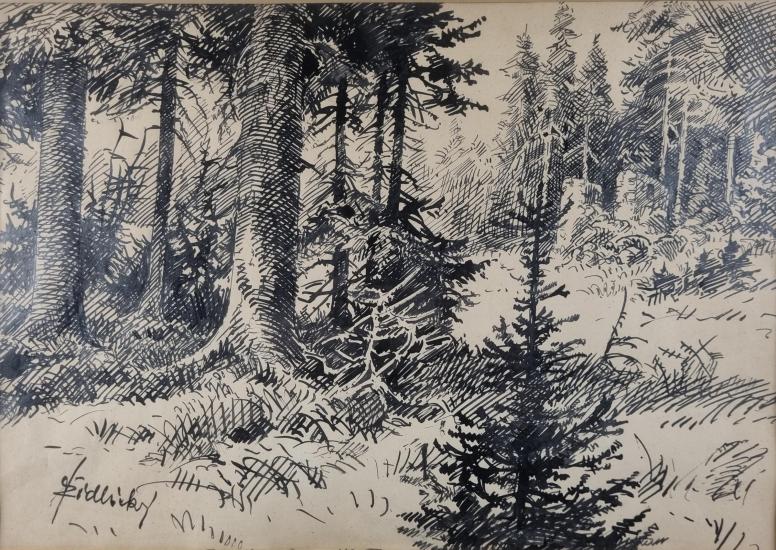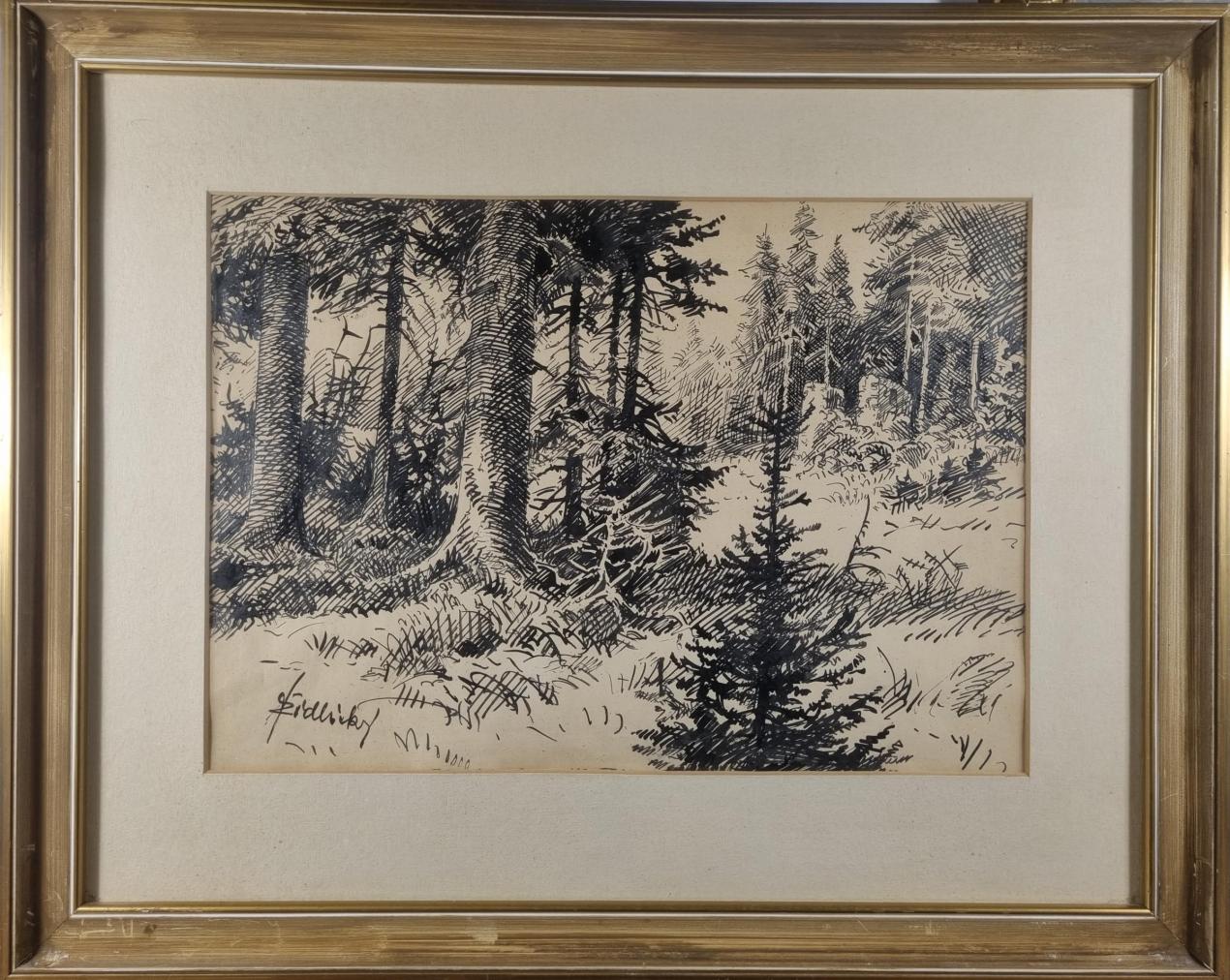 Prohlednout celou aukciKrásná kresba lesa od autora Jiřího Židlického. Umělec byl mistr šrafury, za pomocí kombinace šrafur různých směrů vytváří celý obraz, střídá tloušťku linek, vytváří věrohodnou perspektivu a hloubku v obraze. Perokresba na papíře, rámováno pod sklem, rozměry s rámem 61 x 49 cm, rozměry díla 42 x 30 cm. Signováno vlevo dole "Židlický". Rám lokálně poškozen.