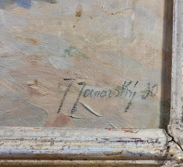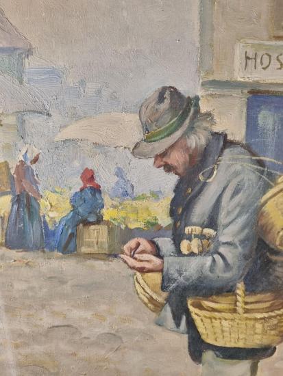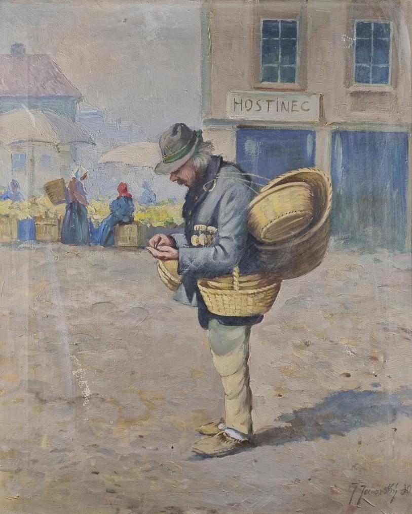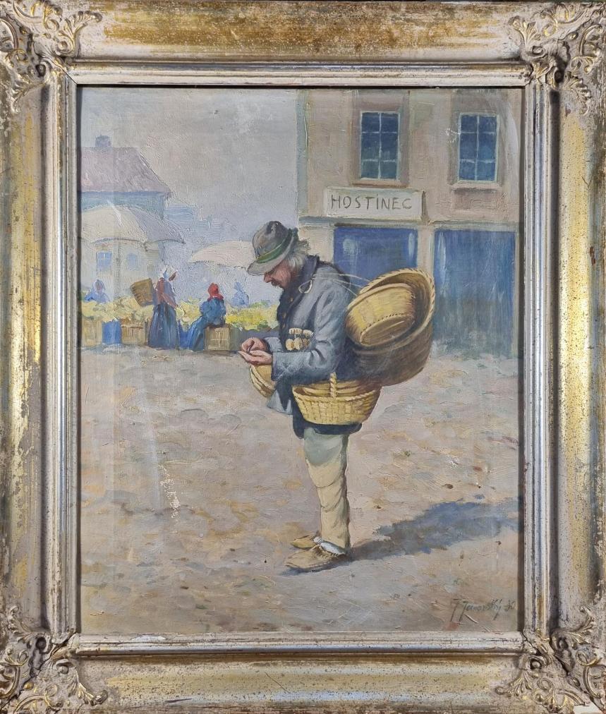 Obraz jehož hlavním motivem je košíkář, počátající mince v dlani, stojící stranou od trhu. Olej na plátně, zarámováno. Rozměry malby jsou 48 x 59 cm. Celkové rozměry s rámem jsou 63 x 74 cm. Signatura se nachází na pravé straně dole: J Janovský 30. Rám je lokálně poškozen na pravé straně dole a levé straně nahoře a místy se na něm objevují škrábance.