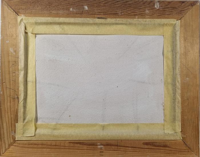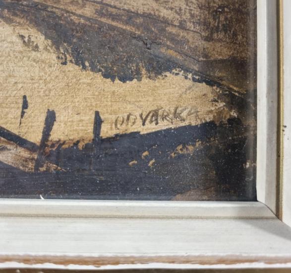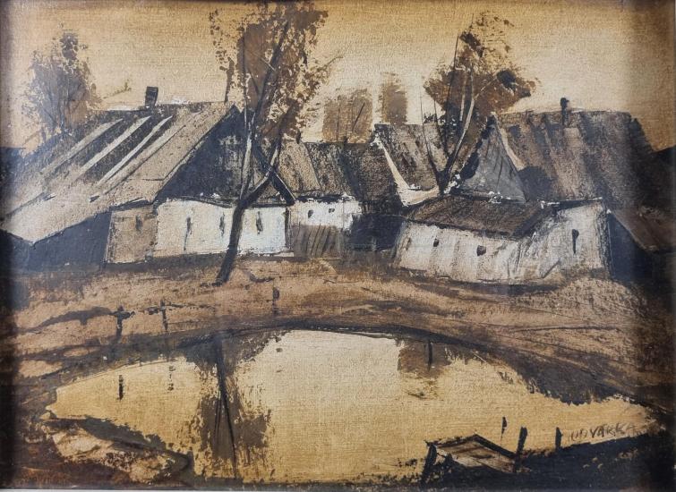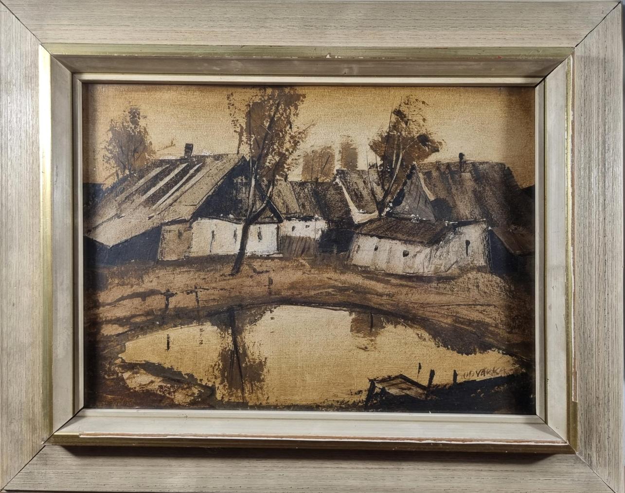 Typická malba Jana Odvárky, kde malíř zachycuje pohled na chalupy z druhé strany rybníku. Rozměry malby jsou 24 x 33 cm. Rozměry s rámem jsou 37 x 47 cm. Zarámováno pod sklem. Olej na papíře. Signatura se nachází na pravé straně dole: Odvárka. Rám je lehce poškozen na několika místech. Papír je mírně zvlněný. Podlepeno z druhé strany lepící páskou viz foto.