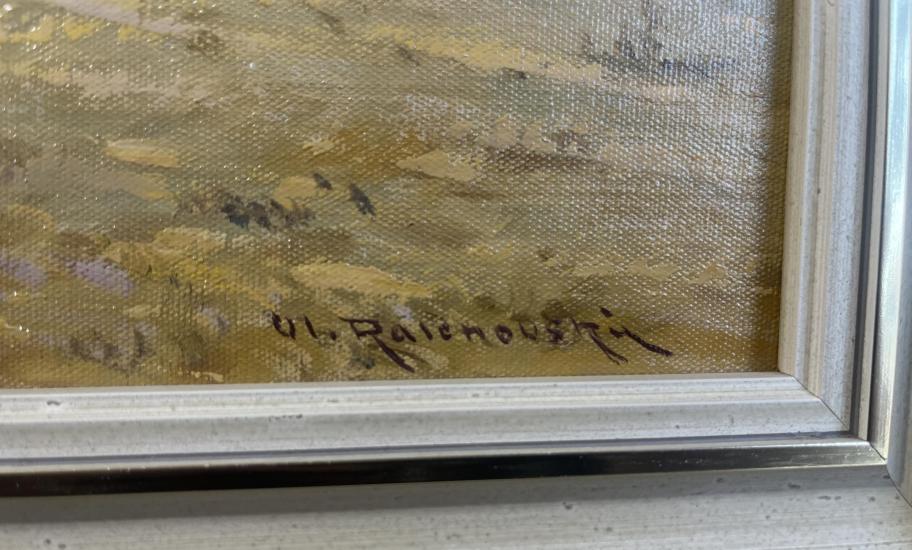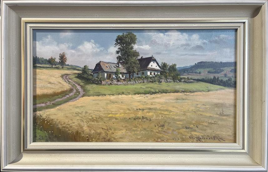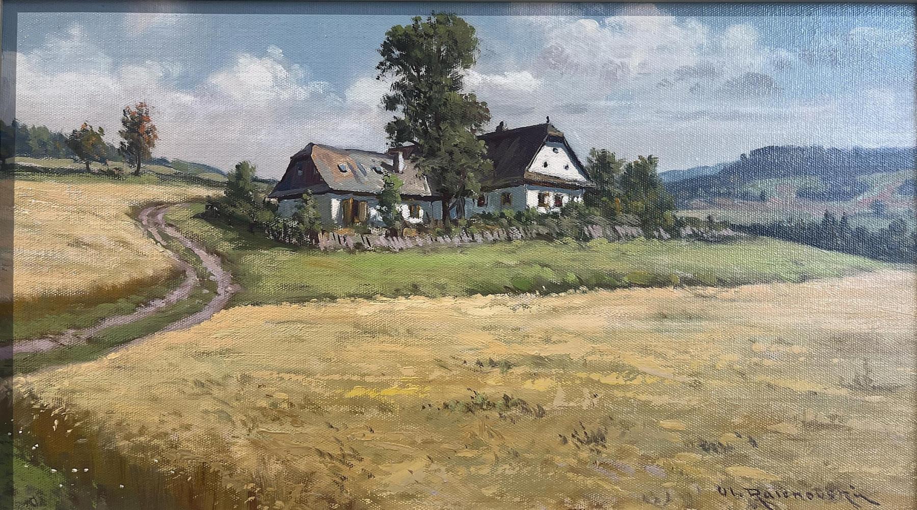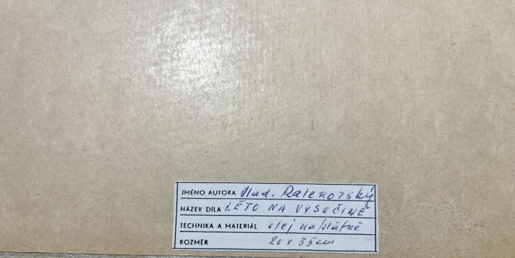 Drobné dílo od malíře Vladimíra Ralenovského, vyobrazující chaloupku uprostřed polí na Vysočině. Olej na sololitu. Rozměry malby jsou 33 x 19 cm. Rozměry s rámem jsou 42 x 28 cm. Ze zadní strany nalepen autorský štítek. Signatura se nachází na pravé straně dole Vl. Ralenovský.