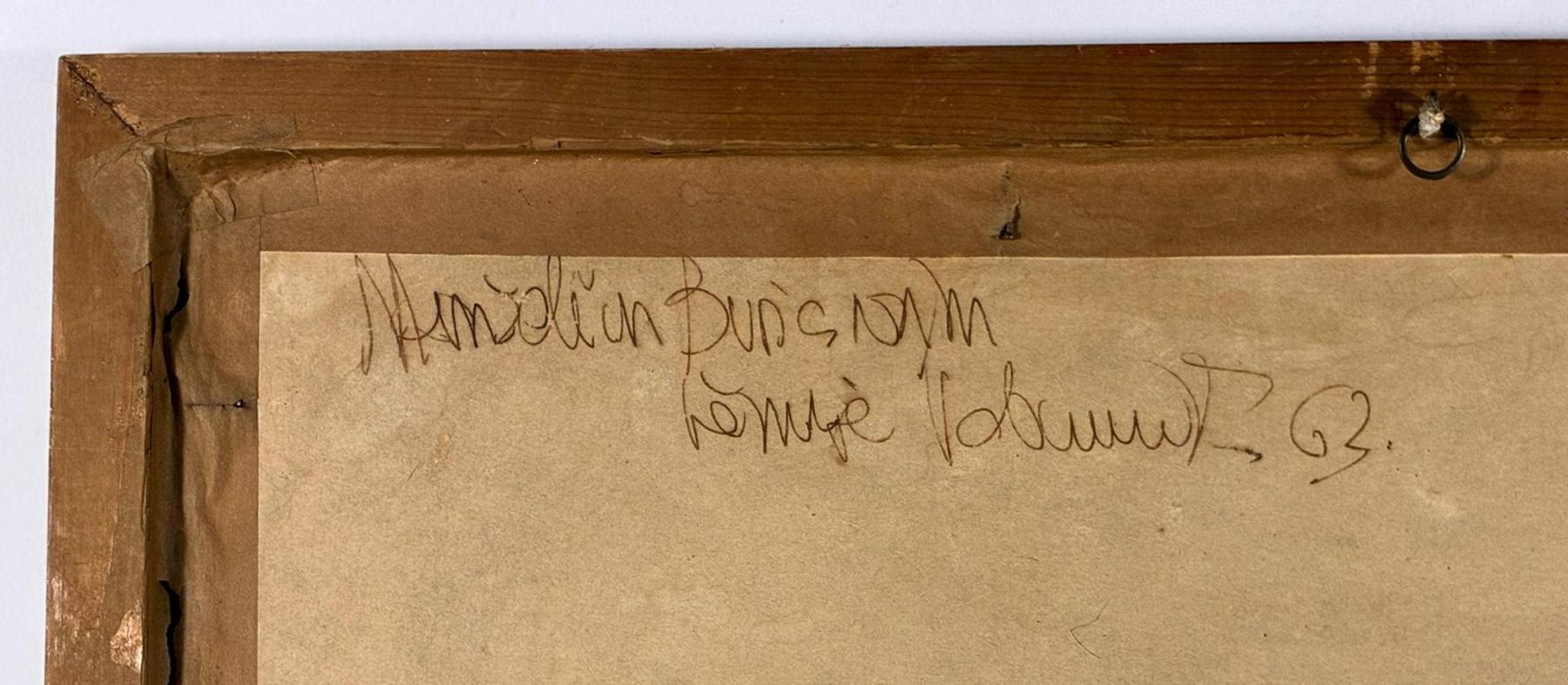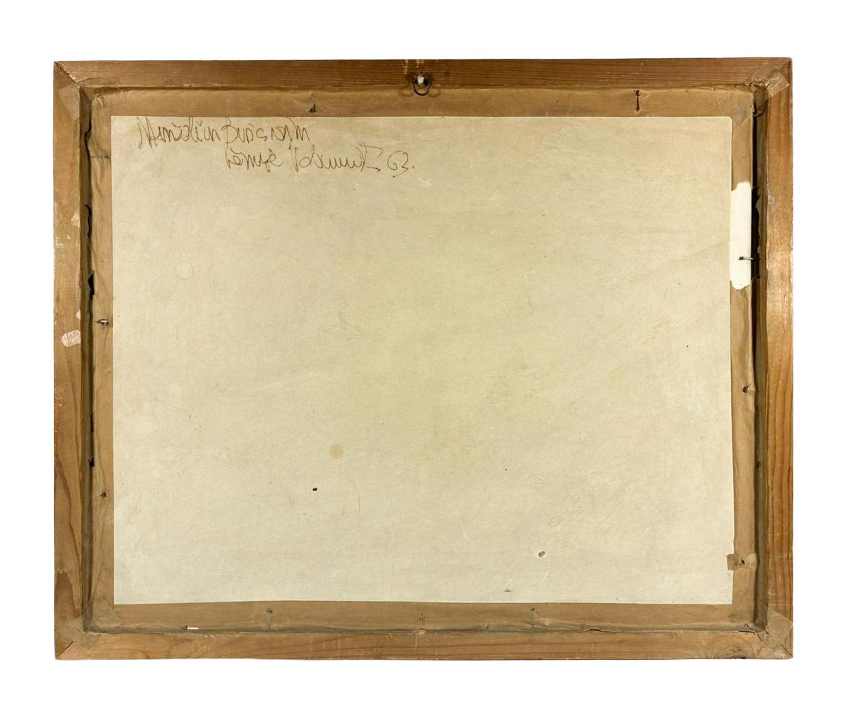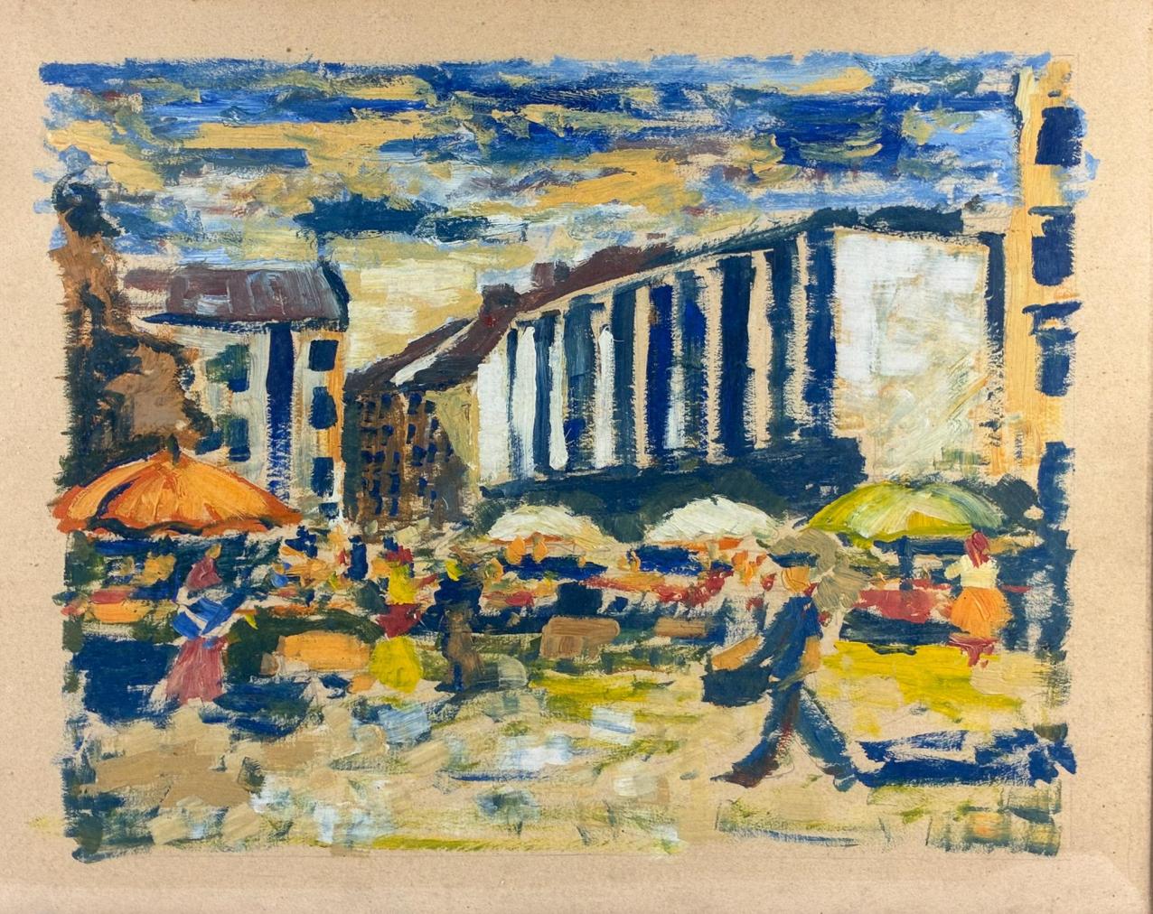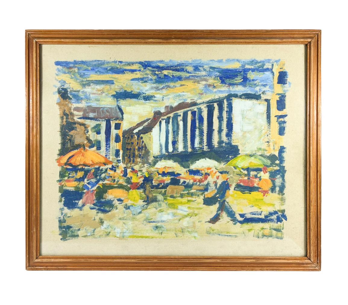 Příjemné dílo s námětem pohledu na náměstí, na kterém se rozprostírá tržnice. Umělec sahá po odstínech modré a žluté, za pomocí kterých vytváří většinu díla. Dílo je expresivně laděné, ve změti hrubých čar, ploch a skvrn kladených těsně vedle sebe se rýsuje náměstí s trhovci. Akryl na papíře, rámováno pod sklem, rozměry s rámem 54 x 44 cm, rozměry díla 42 x 32 cm. Na zadní straně nečitelný popis.