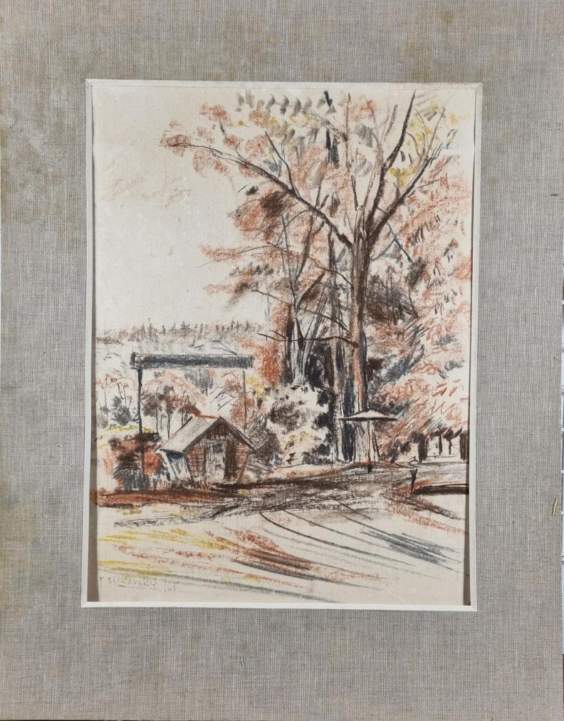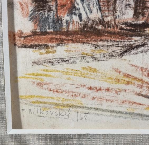 Kresba od Františka Bílkovského s námětem krajiny. Umělec omezuje svou barevnou paletu na červenou, hnědou, černou a žlutou barvu, čímž vytváří dojem podzimní krajiny. Kresba je provedená energickými tahy, bez velkých detailů, autor se snaží zachytit místo a jeho atmosféru. Pastel na papíře, paspartováno, rozměry s paspartou 59 x 46 cm, rozměry díla 42 x 31 cm. Signováno vlevo dole "F. Bílkovský 68".