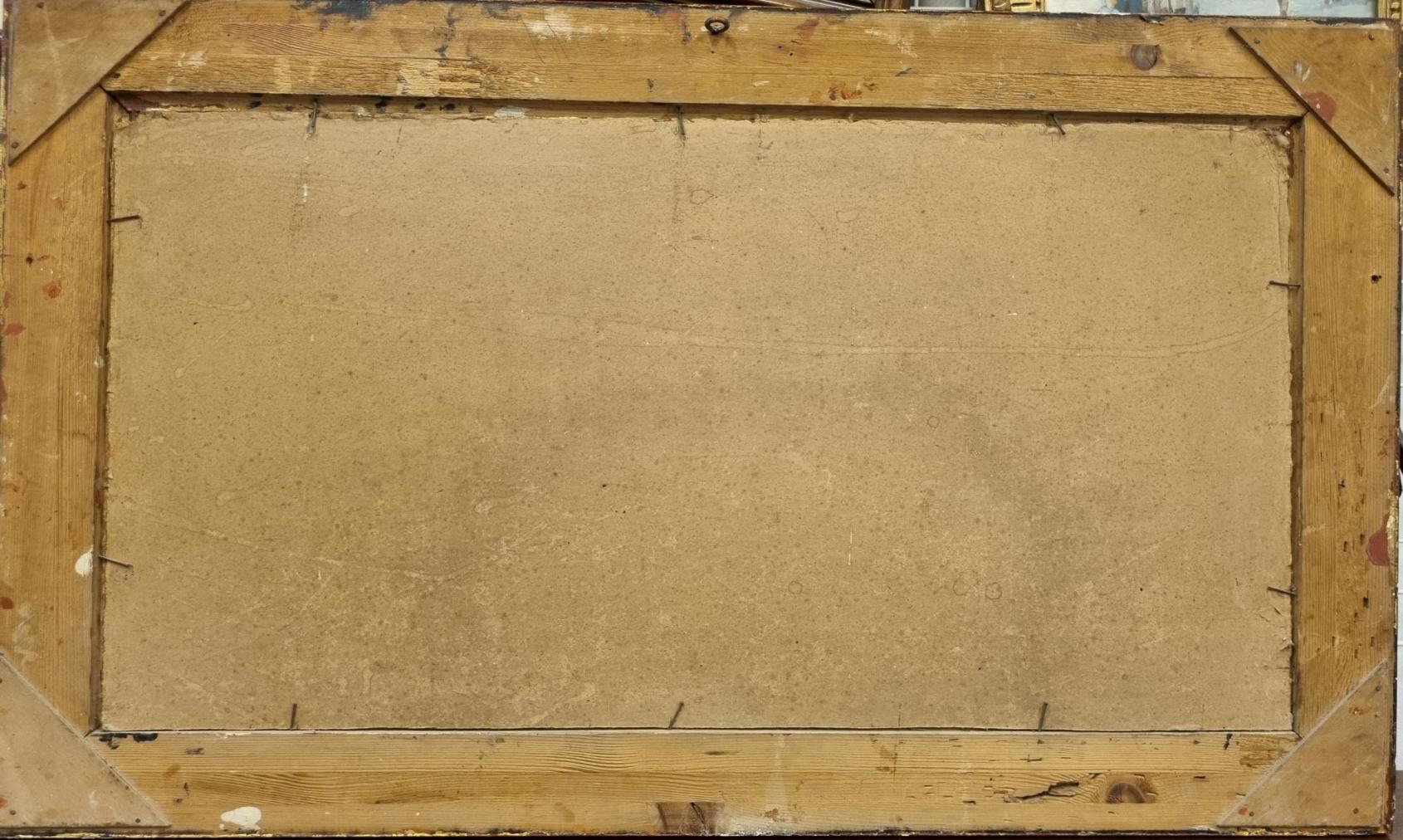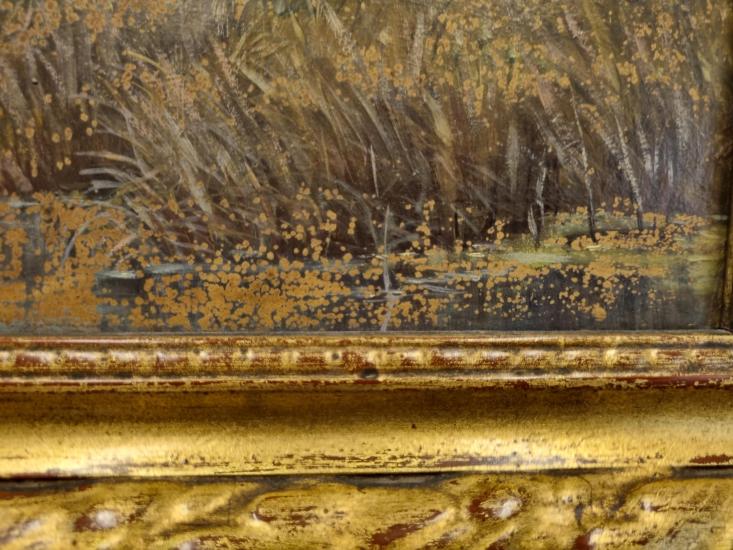 Příjemná, detailní malba projasněné krajiny s pohledem na břízky, rostoucí podél bystřiny, u níž se pase pár vysoké zvěře. Olej na kartonu. Zarámováno do masivního dřevěného rámu se zlatou patinou. Rozměry malby jsou 77 x 40 cm, rozměry s rámem jsou 93 x 55 cm. Karton je na pravé straně nahoře v rohu mírně poškozen. Signováno na levé straně dole M. Höber.