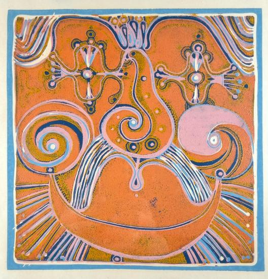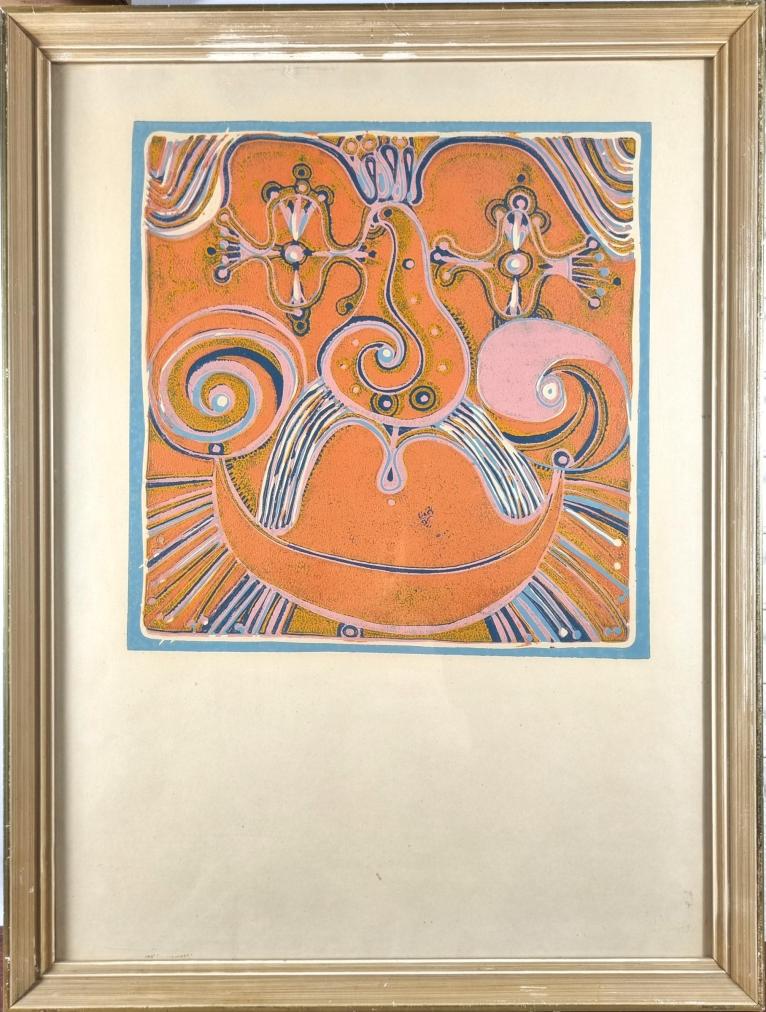 Příjemné dílo od Jiřího Elišky abstraktního chrakteru. Umělec komponuje různé oblé tvary, linky a formy, vše se navzájem dotýká a proplétá. Dílo lehce připomíná umění hnutí art-brut, které čerpá z neřízených myšlenkových procesů proudících z nevědomí. Obraz je příjemný i svou symetrií, ve změti tvarů a čar vyniká symetrická pravidelnost. Grafika na papíře, rámováno pod sklem, rozměry s rámem 48 x 36 cm, rozměry díla 26 x 25 cm.