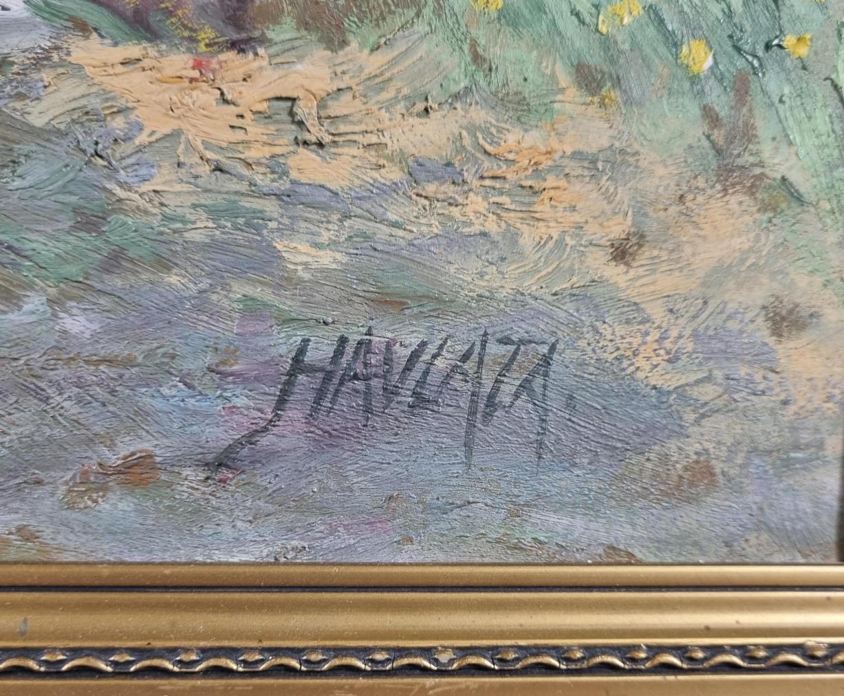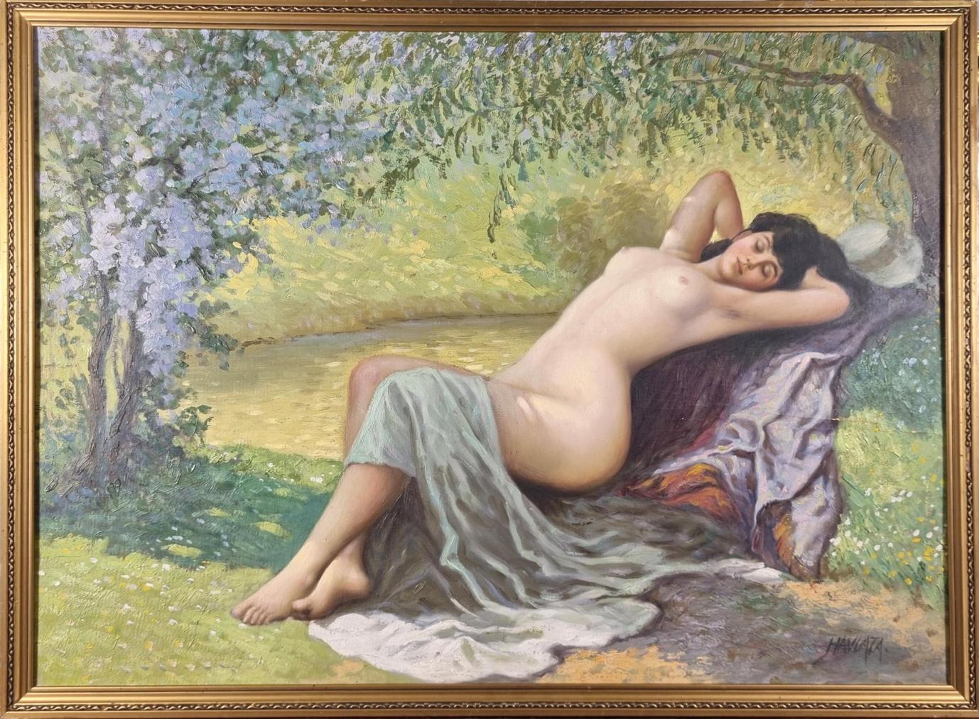 Dílo od umělce Karla Havlaty, které vyplňuje zeleň, vodní hladina a nahá žena ležící v krajině. Žena se opírá o kmen stromu, přes stehno má přehozený šátek a zasněně odpočívá. Umělec krásně tvaruje tělo, na kterém slunce maluje drobné odlesky, celý výjev působí půvabně a je plný klidu. Zatímco při ztvárnění krajiny používá umělec tečky a krátké tahy vedle sebe, u figury se snaží o uhlazenou malbu, ve které plochy vzájemně přecházejí jedna do druhé. Olej na kartonu, rámováno, rozměry s rámem 70 x 52 cm, rozměry obrazu 66 x 47 cm. Signováno vpravo dole "Havlata".
