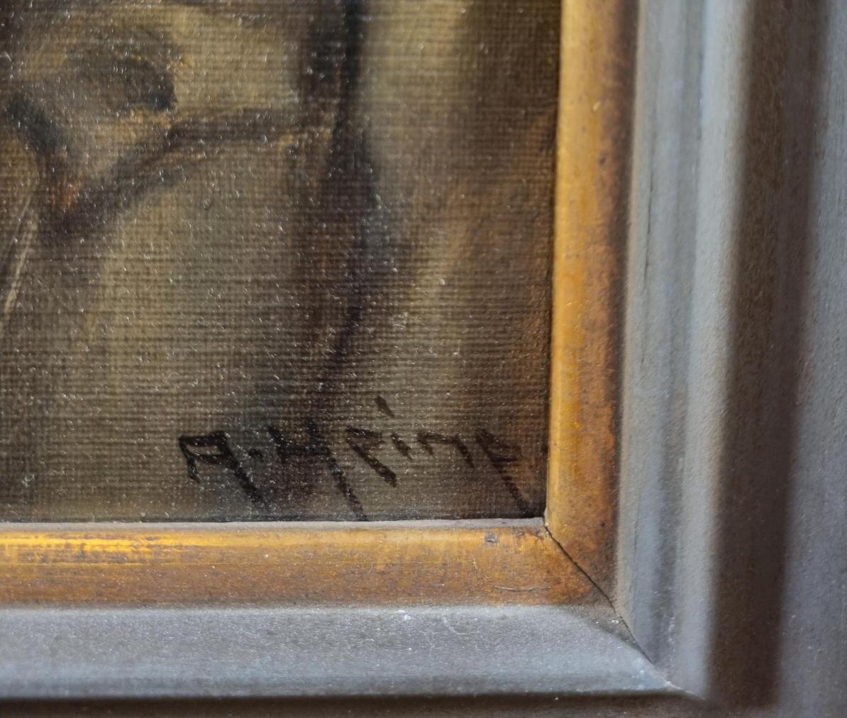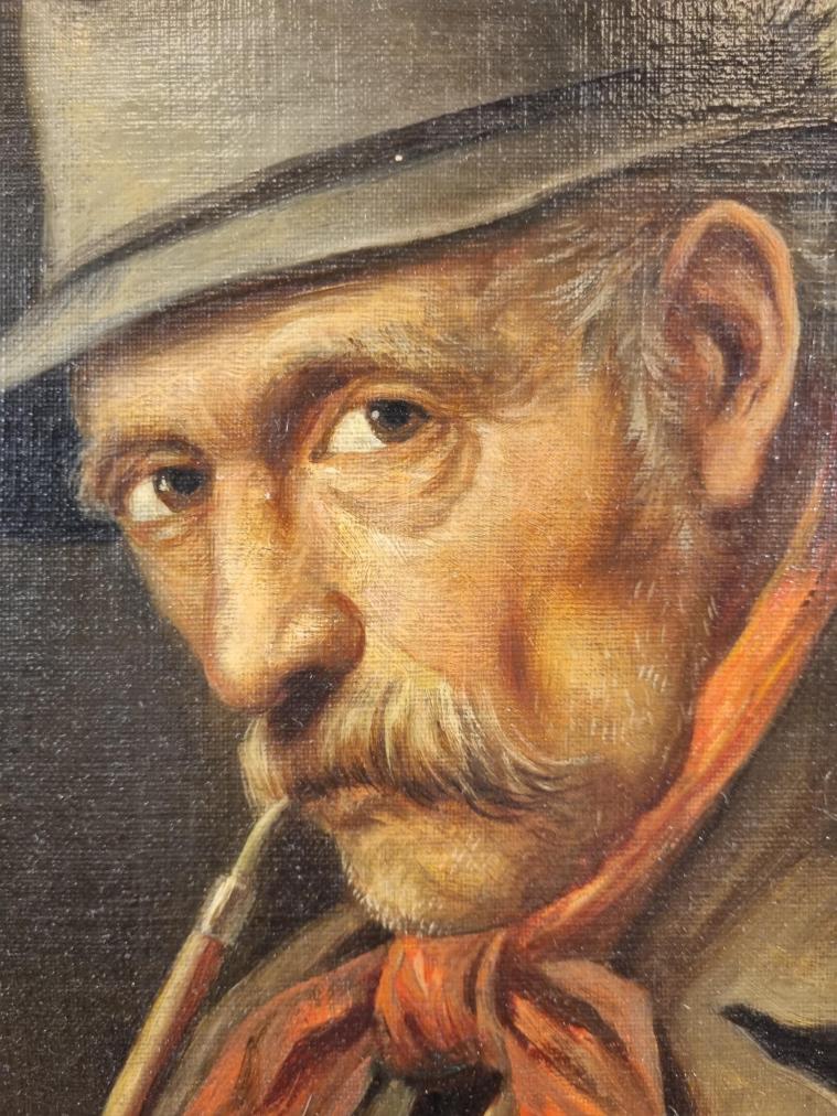 Pěkný obraz s námětem muže s dýmkou. Muž je oděný v kabátu a na hlavě má klobouk s peřím, kolem krku má červený šátek. Detail jelena na dýmce naznačuje, že je to myslivec. Malba je realisticky zpracovaná, hlavním cílem je věrně zachytit portrétovaného. Olej na desce, rámováno, rozměry s rámem 54 x 43 cm, rozměry díla 39 x 28 cm. Signováno vpravo dole "A. Heine".