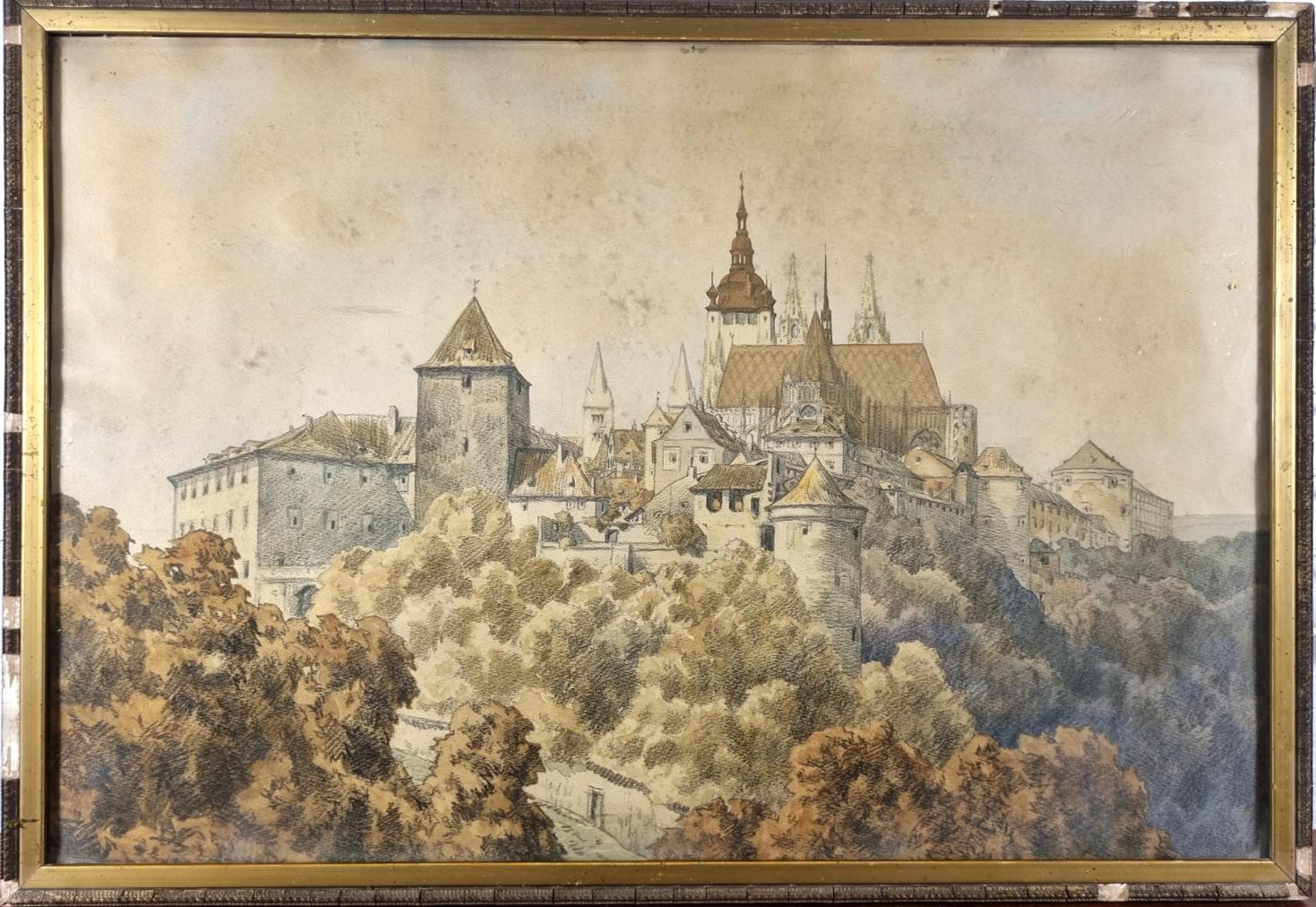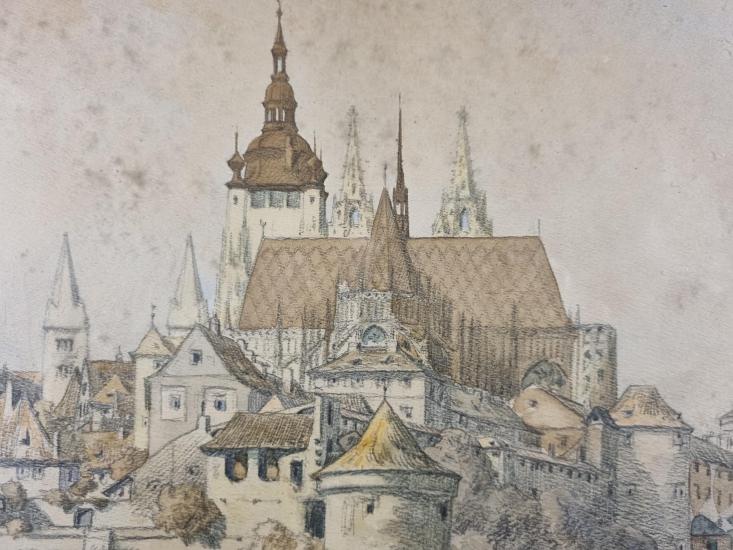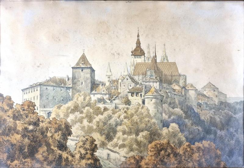 Dílo, které je kombinací kresby a malby s námětem pražských Hradčan. Autor vytváří akvarelové plochy, které tónuje jemnými odstíny barev, ty následně usměrňuje šrafurami, které střídá podle motivu. Vystihuje krásný parčík, který se rozléhá pod Hradčany, se stejným citem přistupuje i k architektuře. Kombinovaná technika na papíře, rámováno pod sklem, rozměry s rámem 57,5 x 40,5 cm, rozměry díla 54 x 36 cm. Rám je zničený. V přpadě zasílání poštou bude rám i sklo odstraněno.