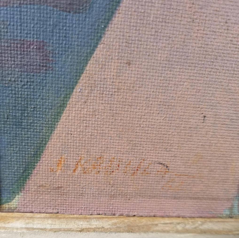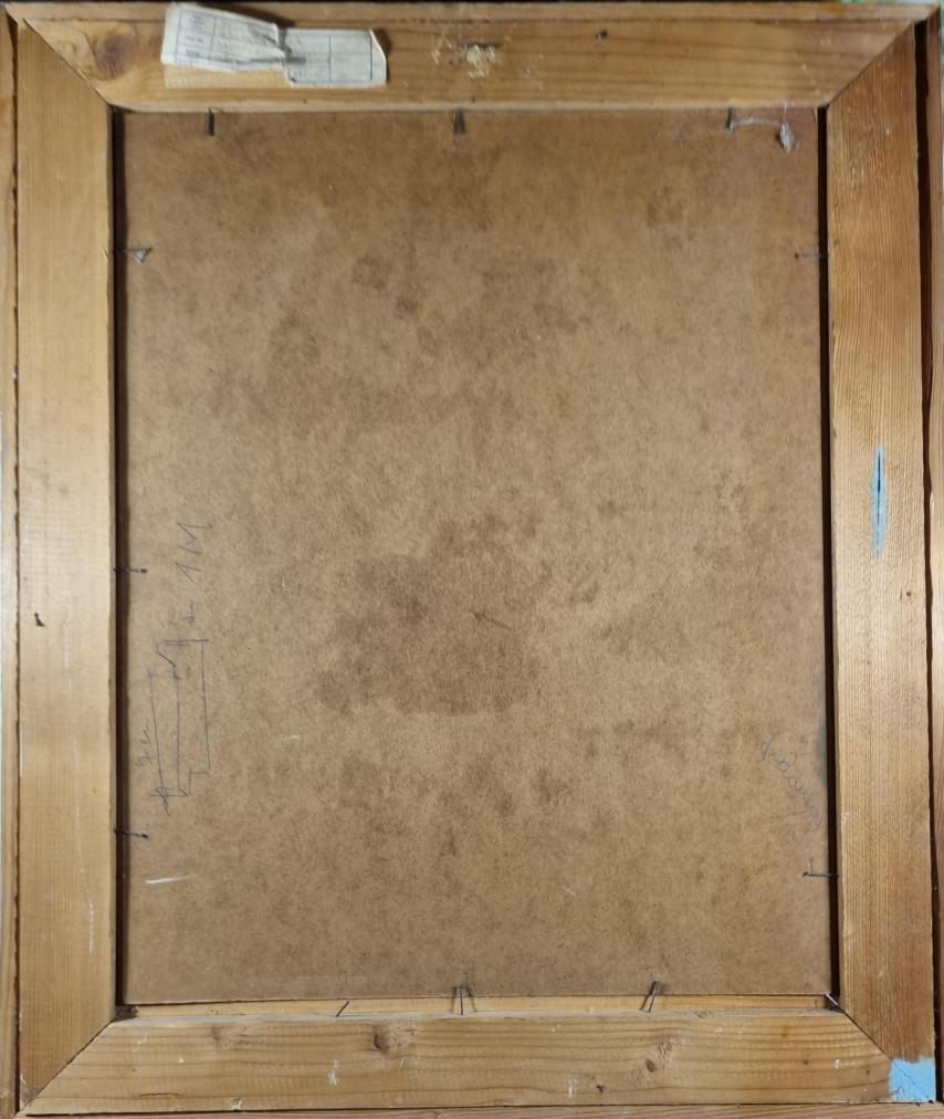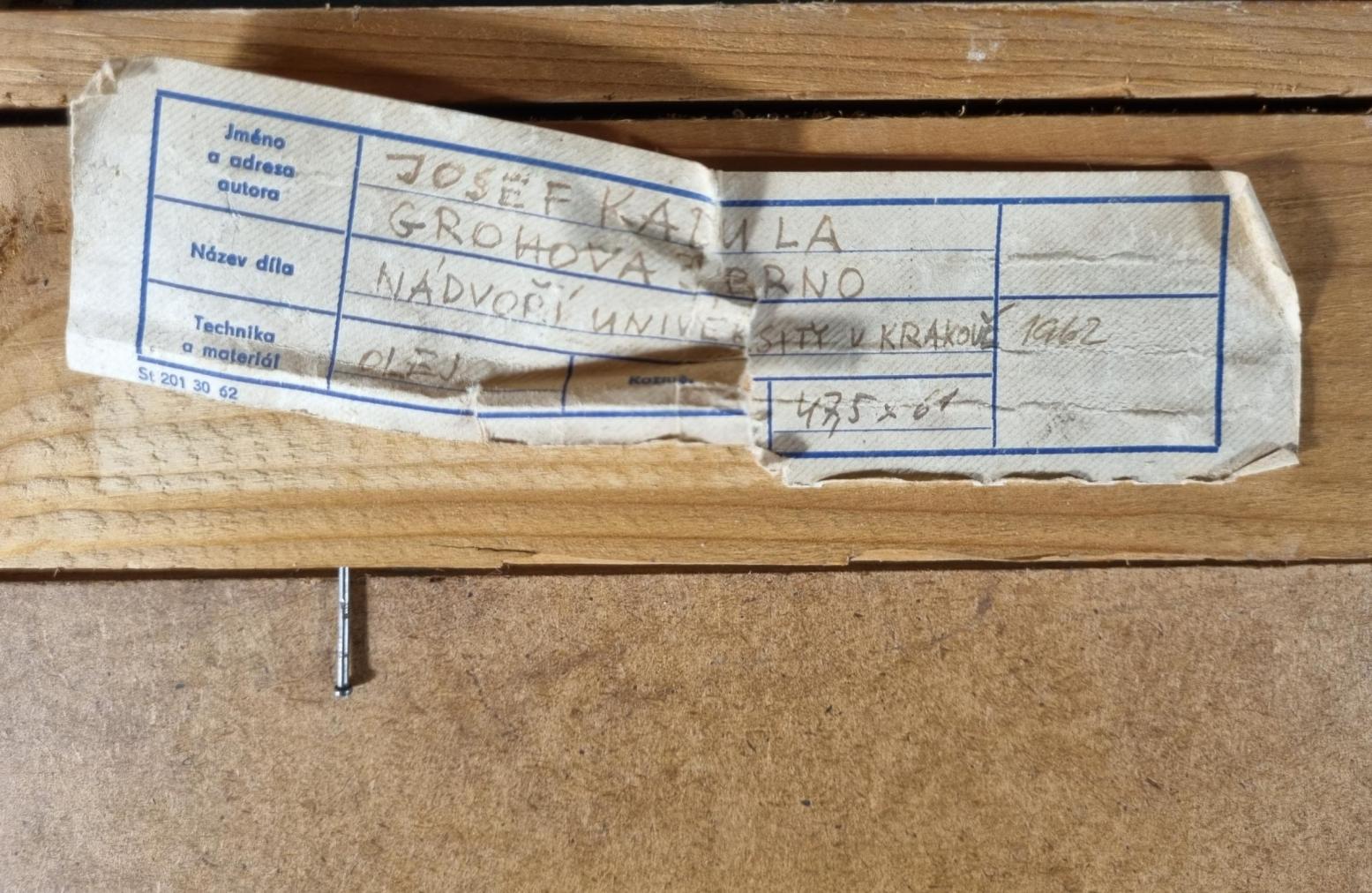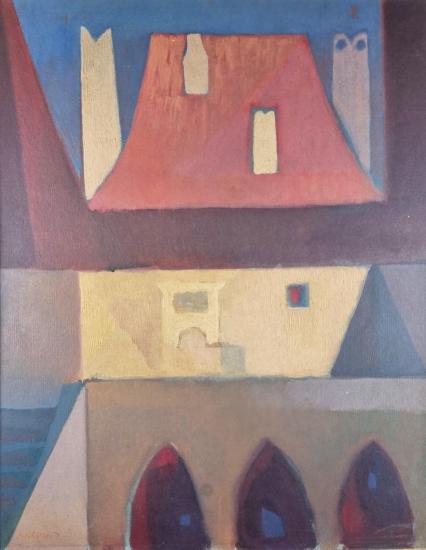 Příjemné dílo od Josefa Kaduly. Umělec pracuje se zjednodušením reality, abstrahuje motiv na barevné plochy, což se snoubí s námětem architektury. Dílo je skvělé kompozičně, nejkontrastnějším místem je rudá zář vycházející z podloubí, která působí tajemně. Olej na sololitu, rámováno, rozměry s rámem 76 x 65 cm, rozměry díla 60 x 47 cm. Signováno vlevo dole "J. Kadula", vzadu autorský štítek viz foto - autor, název díla, technika a datace: 1962.