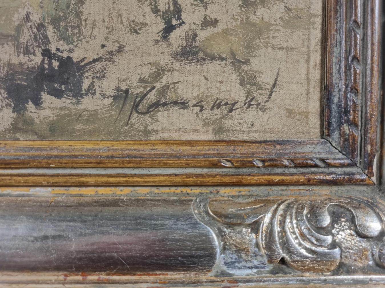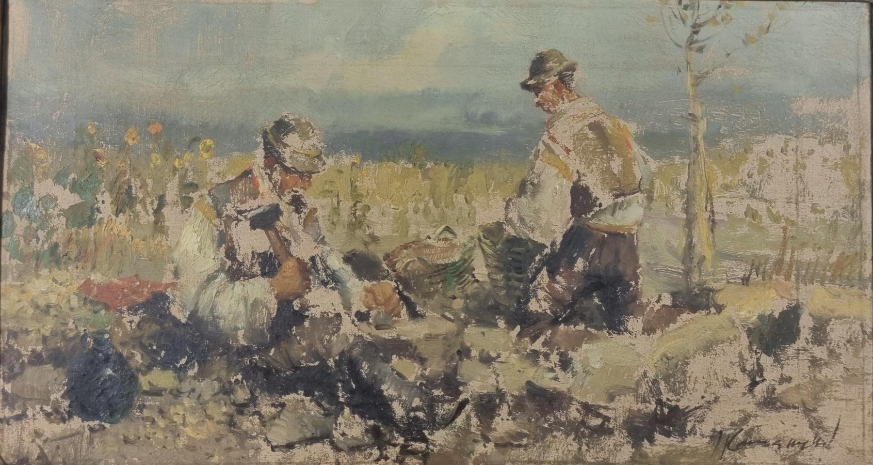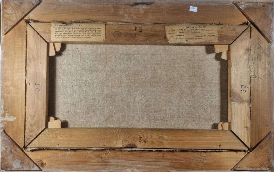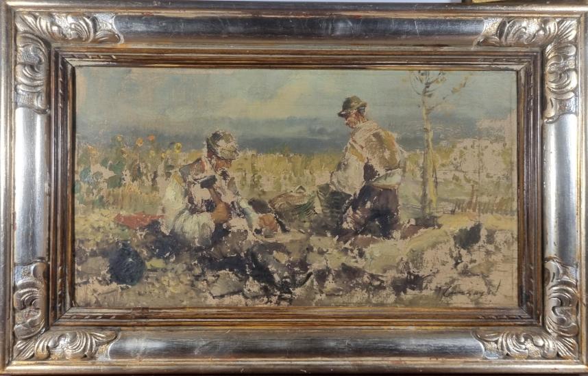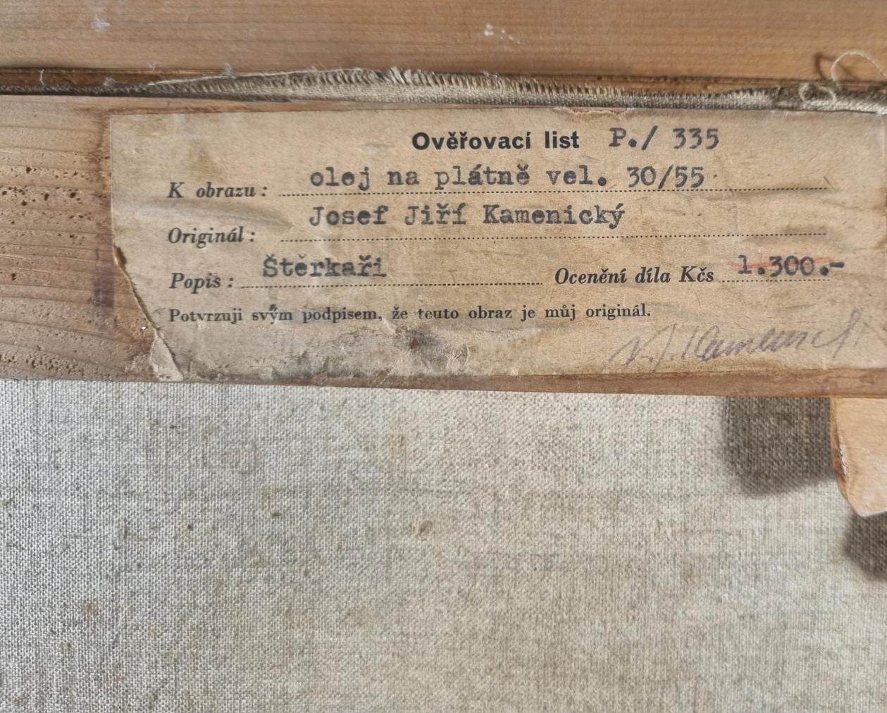 Pěkná malba podlouhlého formátu s námětem dvou mužů, kteří pracují v přírodě. Jeden z mužů drží v ruce kladivo a druhý se sklání a pracuje nad pařezem. Zajímavá jsou na malbě čistá místa bez barvy, malba působí nedokončeným dojmem, autor pracuje s podkladem jako s barevnou plochou. Díky prosvítání plátna je malba tlumená. Olej na plátně, rozměry s rámem 69 x 44 cm, rozměry díla 54 x 30 cm. Signováno vpravo dole "J. Kamenický", vzadu autorský štítek s infomacemi o autorovi, názvem, technikou a rozměrem obrazu.
