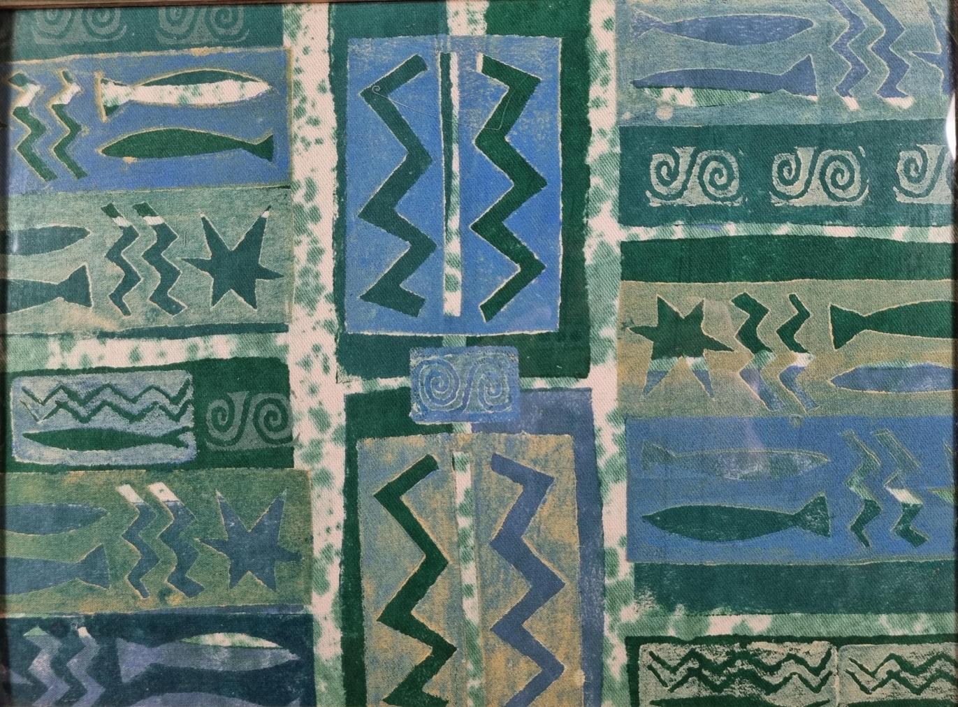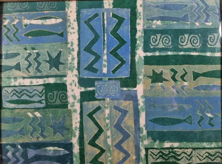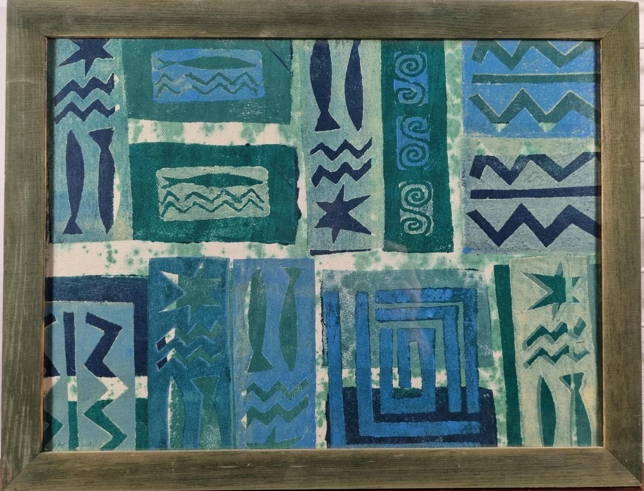 Dílo od Zuzany Krajčovičové v modrých a zelených odstínech. Umělkyně zaplňuje celý formát opakováním stejných symbolů, podklad vytváří za pomocí skvrn zelené barvy na světlé textilii. Poté vrství barevné plochy přes sebe. Kombinovaná technika na textilii, rámováno pod plexisklem, rozměry s rámem 43 x 33 cm, rozměry díla 27,5 x 37,5 cm. Nesignováno. Plexisklo má v jedné části rýhu.