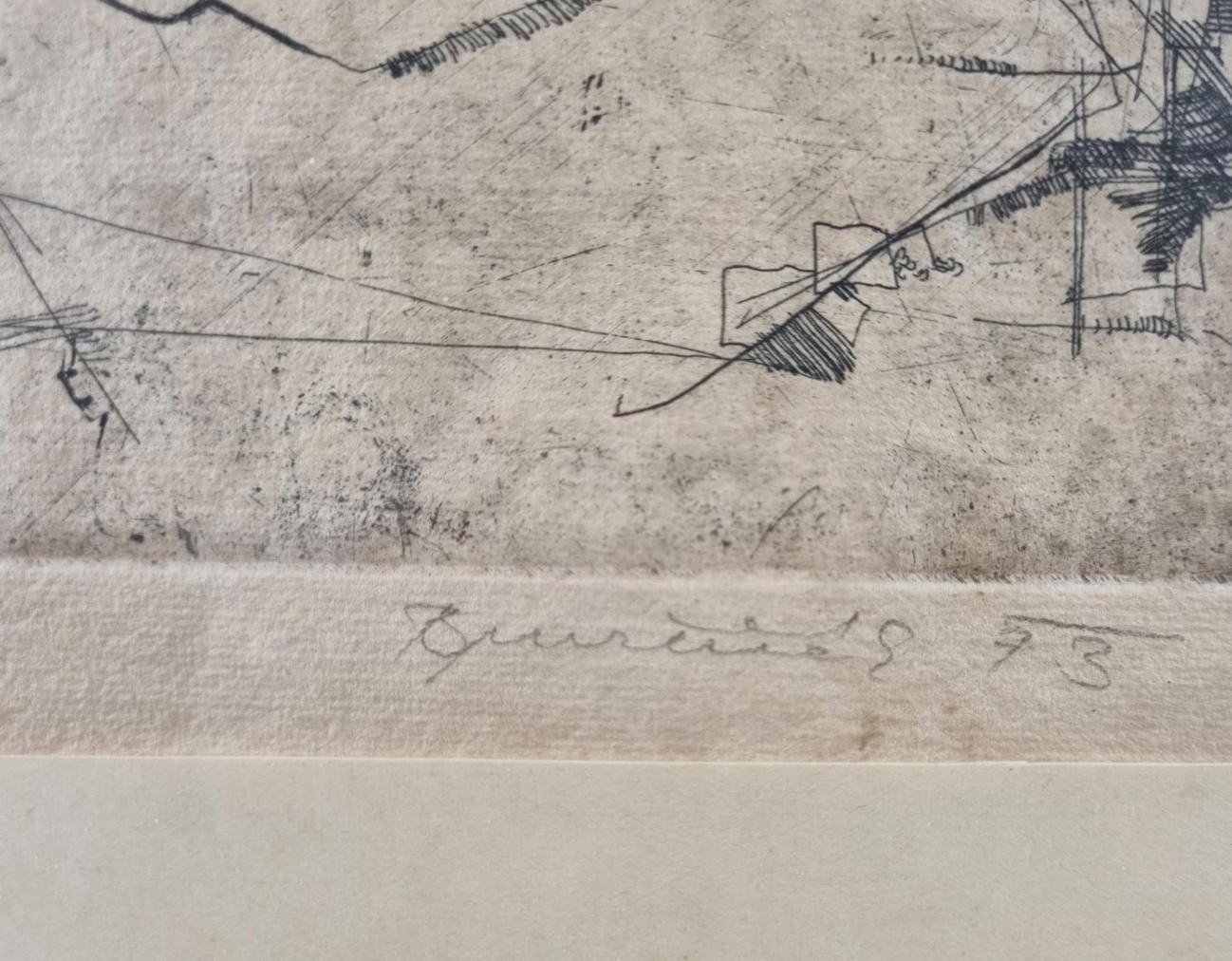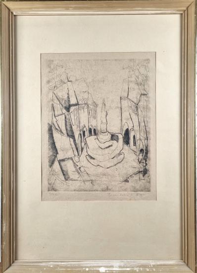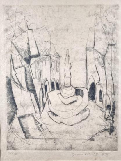 Skvělé grafické dílo s pohledem na náměstí s kašnou. Umělec výborně pracuje s pokřivením reality, veškeré budovy a prostor se hroutí a vzniká zvláštní, pokroucená perspektiva. Dílo působí příjemně především uvolněným rukopisem, který autor používá, místy se motiv snaží šrafurou prokreslit, jinde ho nechává vyznít v náznaku. Suchá jehla na papíře, rámováno pod sklem, rozměry s rámem 48 x 34,5 cm, rozměry díla 24 x 18 cm. Signováno - neznám.