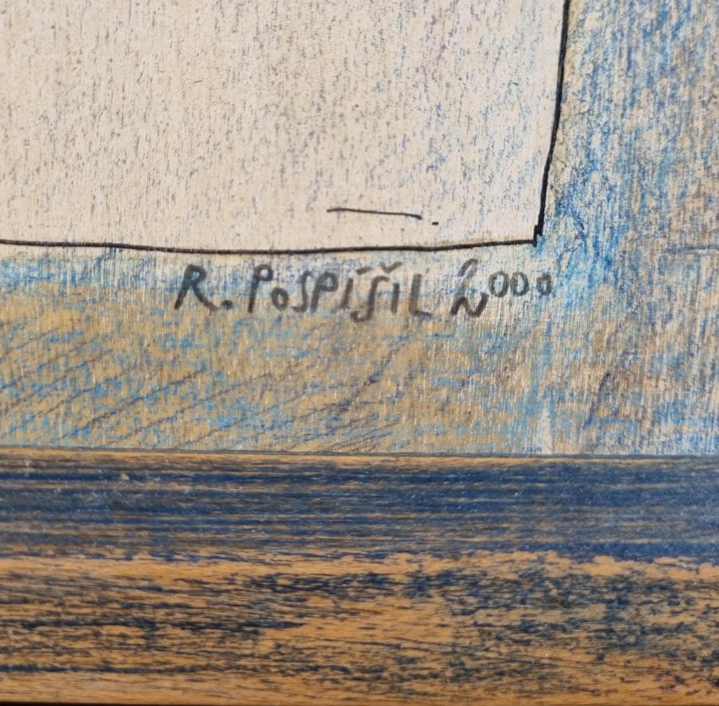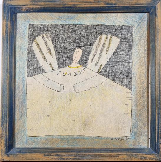 Roztomilé dílo od Rostislava Pospíšila s námětem anděla. Umělec předimenzoval postavu anděla, jeho tělo vyplňuje celý formát a záda zdobí křídla, kde autor vytváří detaily peří. Anděl má malinkatou hlavu, což posiluje vtipný a roztomilý efekt, spokojený výraz ve tváři dokresluje nápis I love heaven. Kombinovaná technika na dřevěné desce, rámováno, rozměry s rámem 30,5 x 30,5 cm, rozměry díla 25 x 25 cm. Signováno vpravo dole "R. Pospíšil 2000"