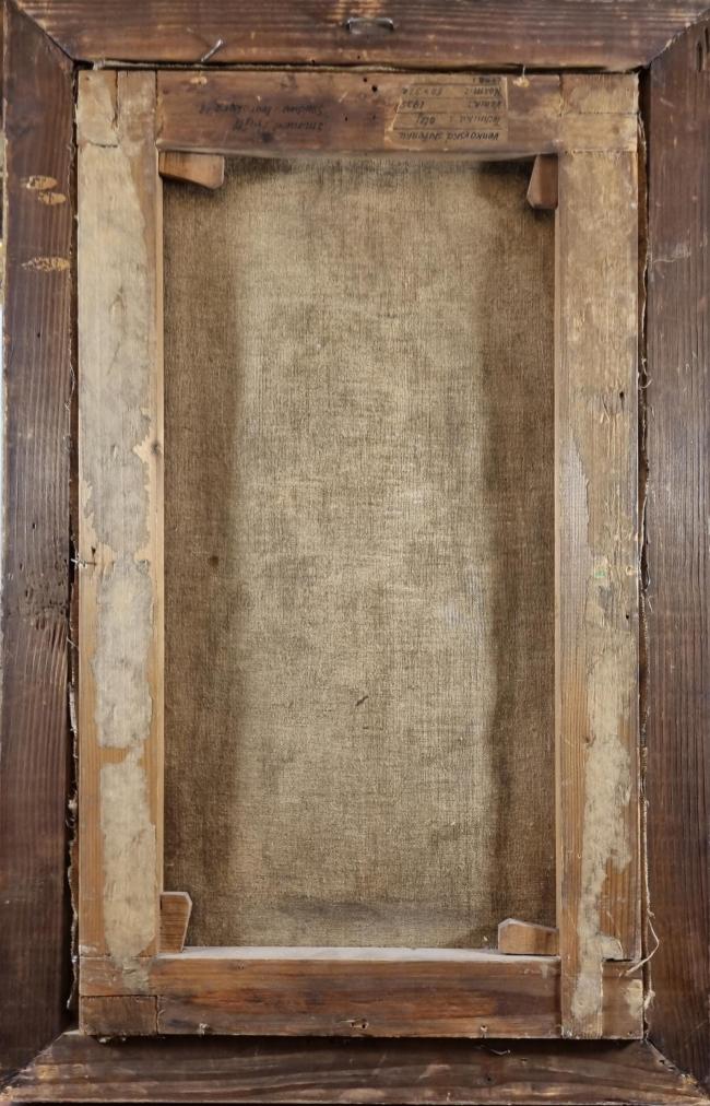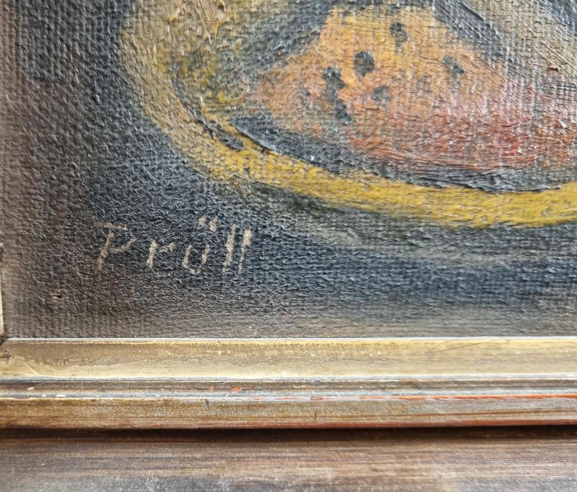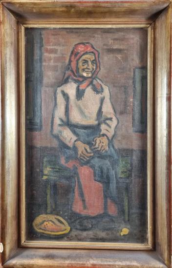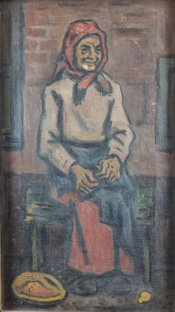 Pěkný obraz od autora Emanuela Prülla. Námětem se mu stává figura staré ženy, která sedí v poklidu před domem a na tváři má spokojený úsměv. Umělec vytváří malbu za pomocí silných tahů, sahá po tmavých tónech a jednotlivé plochy mírně stínuje. Výrazným prvkem je černá linka, která definuje všechny obrysy. Olej na plátně, rámováno, rozměry s rámem 66 x 42 cm, rozměry díla 56 x 31 cm. Signováno vlevo dole "Prüll".