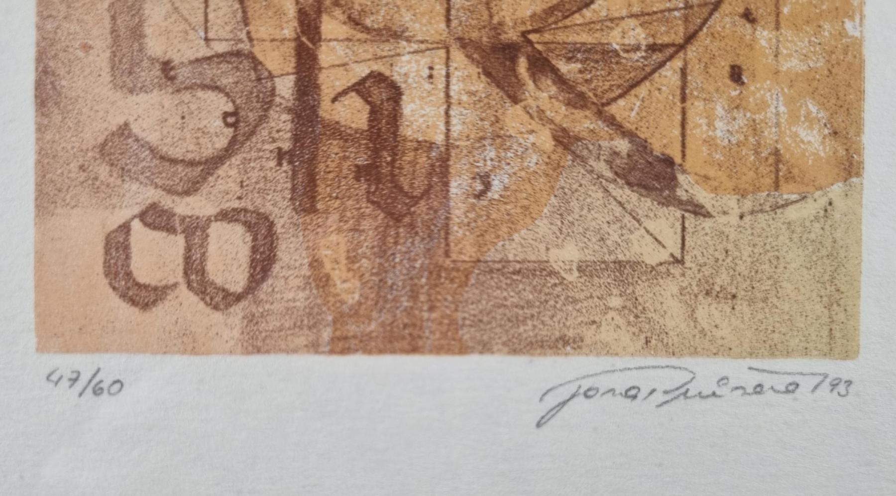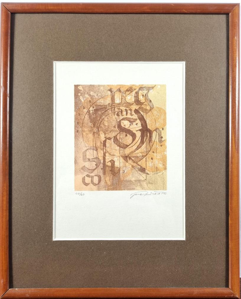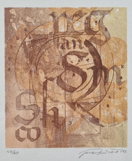 Grafika od Jany Průšové v hnědo-oranžových odstínech. Umělec pracuje v díle s typografií jako nosným prvkem obsahu, písmo a kružnice se stávají předměty grafiky s metaforickým přesahem. Kaligrafická grafika na papíře, rozměry s rámem 31,5 x 25,5 cm, rozměry díla 11 x 9,5 mm. Signováno vpravo dole " Jana Průšová", výtisk 47/60.