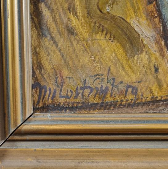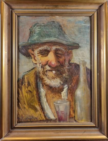 Skvělá malba s námětem portrétu starce. Muž sedí nejspíš v hospodě, před sebou má pohárek a prázdnou láhev a ve tváři má velmi spokojený výraz. Malba je příjemná, umělec pečlivě vytváří plochy, které usměrňuje linkami. Nakonec přidává bílé detaily v podobě odlesků. Olej na sololitu, rámováno, rozměry s rámem 54 x 41 cm, rozměry díla 43 x 30 cm. Signováno vlevo dole "?".