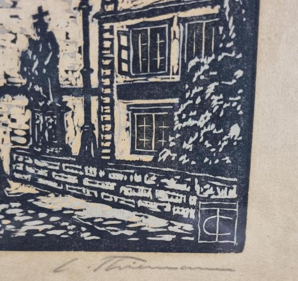 Grafika od autora Carla Thiemanna. Námětem se stala jedna z dominant historického cestra Prahy, mostecká věž. Grafická technika nedovoluje umělci vytvářet precizní detaily, jedná se o hrubší linku charakteristickou pro dřevoryt, za pomocí které tvoří kontrastní grafiku. V místech oblohy je grafika jemně kolorovaná do modrého odstínu. Dřevoryt na papíře, rámováno pod sklem, rozměry s rámem 43 x 35 cm, rozměry díla 30 x 24,5 cm. Signováno vpravo dole "C. Thiemann".