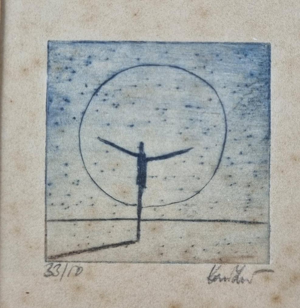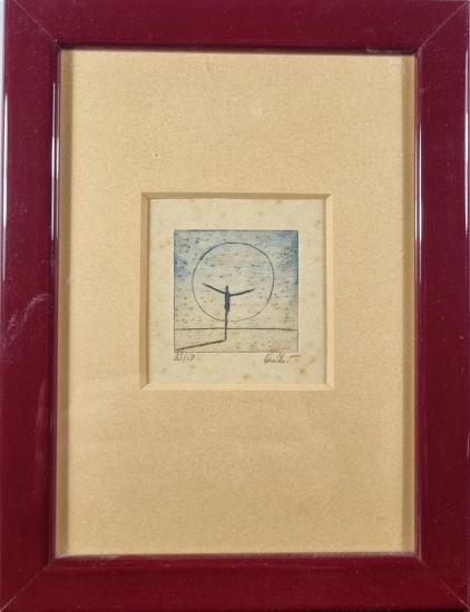 Krásná, roztomilá grafika opravdu drobného formátu s jednoduchým námětem. Umělec vytváří pár tahy postavu, která má rozpřažené ruce, jako by se chystala k objetí. Lze tušit, ze kruh před ním značí slunce, a tak je za osobou dlouhý, tmavý stín. Grafika je kolorovaná modrým odstínem. Suchá jehla na papíře, rámováno pod sklem, rozměry s rámem 24,5 x 18,5 cm, rozměry díla 5 x 5 cm. Signováno vpravo dole ?, výtisk 33/50.