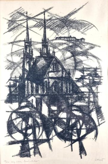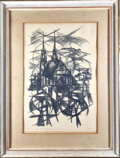 Dílo od autora Luvíka Voneše s brněnským námětem. Autor ztvárňuje dominantu Brna - Petrov, realisticky na pozadí vytváří pohled na památku, kterou šifruje změtí čar a dodává tak dílu novou, svěží rovinu. Litografie na papíře, rámováno pod sklem, rozměry s rámem 50 x 66 cm, rozměry díla 32 x 46 cm. Signováno vpravo dole "Voneš", výtisk 63/200. Vzadu autorský štítek - viz foto.