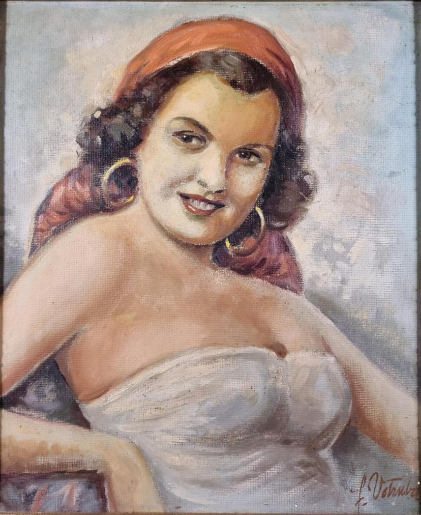 Pěkná malba od Jaroslava Votruby s námětem portrétu ženy, která má široký úsměv na tváři. Mladá žena je spoře oděna, stojí v pozici s rukama v boku, sebevědomě pózuje malíři. Ženu zdobí půvabné tmavé lokny a hluboké, hnědé oči. Olej na sololitu, rozměry s rámem 51 x 45 cm, rozměry díla 39 x 32 cm. Signováno vpravo dole "J. Votruba".