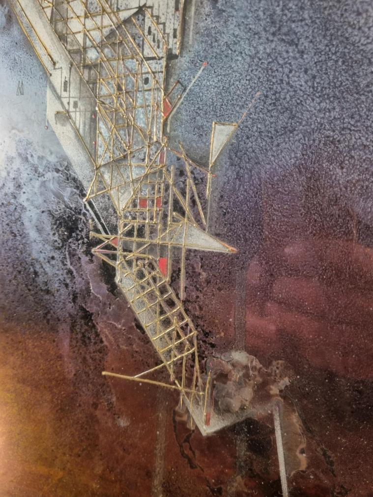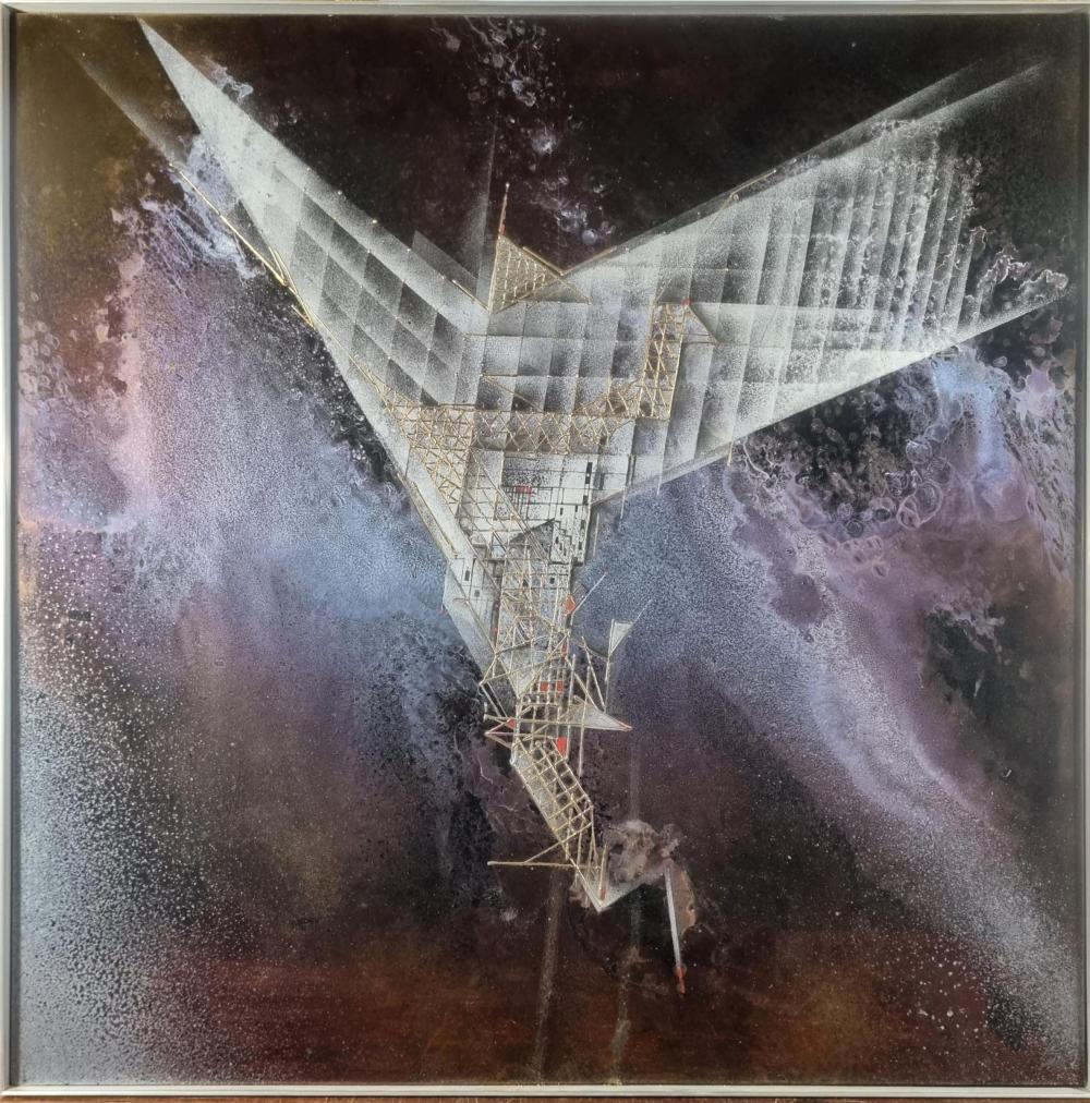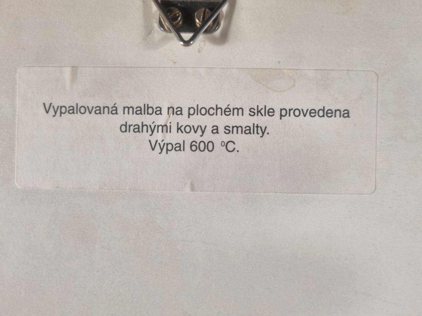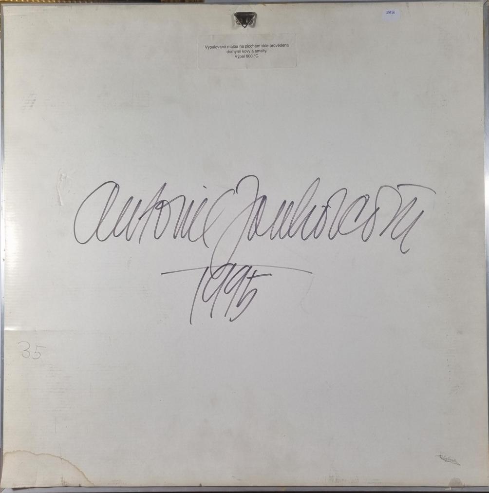 Zajímavé, technicky originální dílo od Antonie Jankovcové. Autorka pracuje s malbou odlišným způsobem, než je typické, na ploché sklo vytváří malbu za pomcí drahých kovů a smaltů. Vzniká abstraktní malba, v díle lze hledat vlastní významy, motiv naznačuje určitý systém, řád, či strukturu. Pálená malba na plochém skle provedená drahými kovy a smalty na 600° výpal, rámováno, rozměry s rámem 51 x 51 cm, rozměry díla 50 x 50 cm. Signováno zezadu - "Antonie Jankovcová 1995", štítek s technikou zezadu.