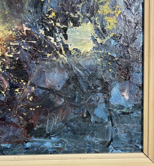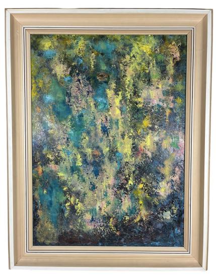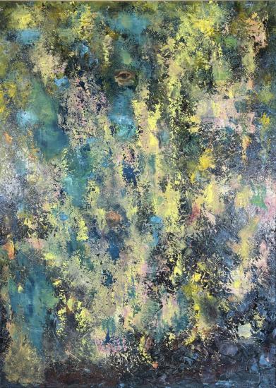 Abstraktní malba utvářená překrývajícími se strukturami barev v odstínech modré a zelené s prvky žluté, růžové a černé. Autorem je Rudolf Zich. Dílo působí jako pohled do vody, kde se na hladině odráží slunce pronikající skrze listí a koruny stromů, ponechává však prostor imaginaci. V horní části obrazu můžeme vidět malbu lidského oka, které moudře pozoruje okolí, ve spodní části je oko zavřené. Rozměry díla jsou 48 x 66 cm. Kombinovaná technika na plátně, zarámováno. Signatura se nachází na pravé straně dole R. Zich. Rám má na hranách lehké oťuky.