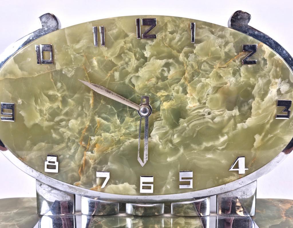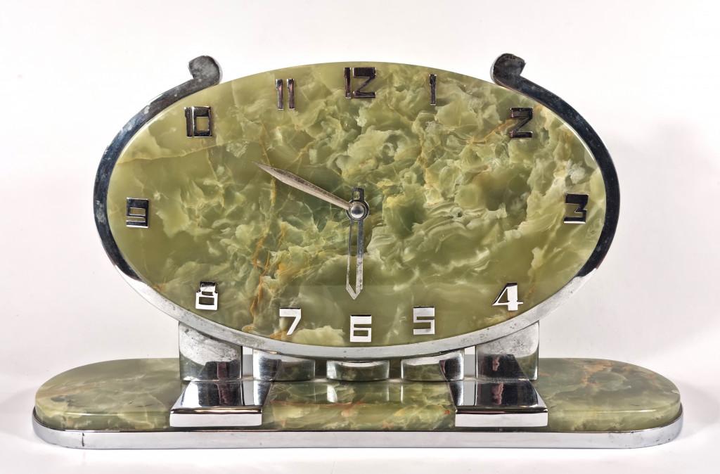 Art deco hodiny mramorové v chromové montáži. Výška 23 cm, šíře soklu 37 cm. Hodiny jsou nefunkční, značené hodinář Vozdecký Brno. mramor bez poškození, mramor místy potřebuje přeleštit.