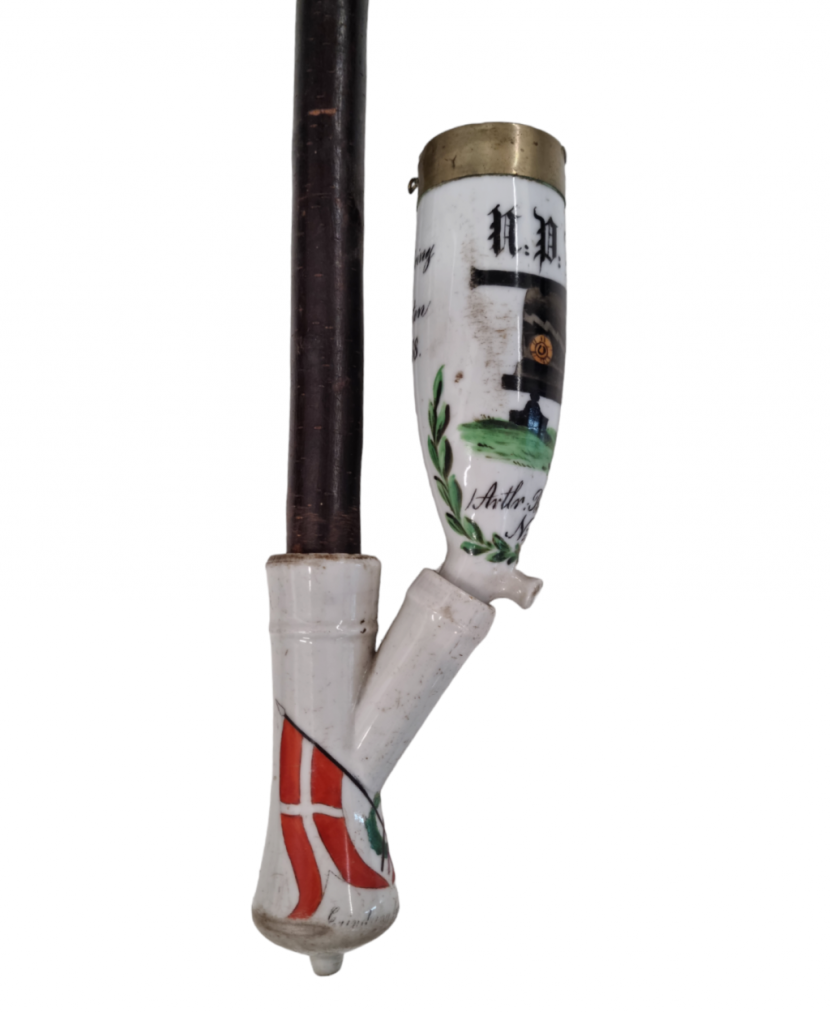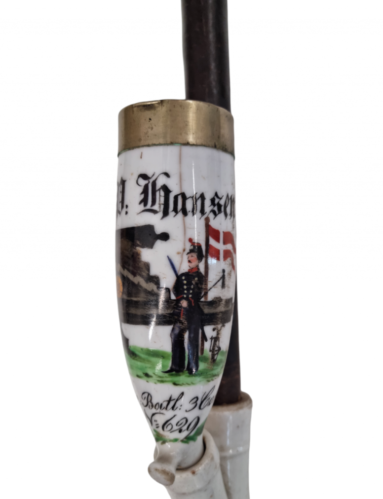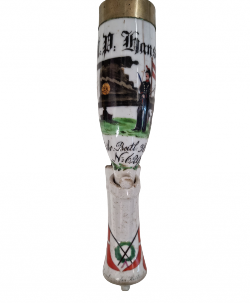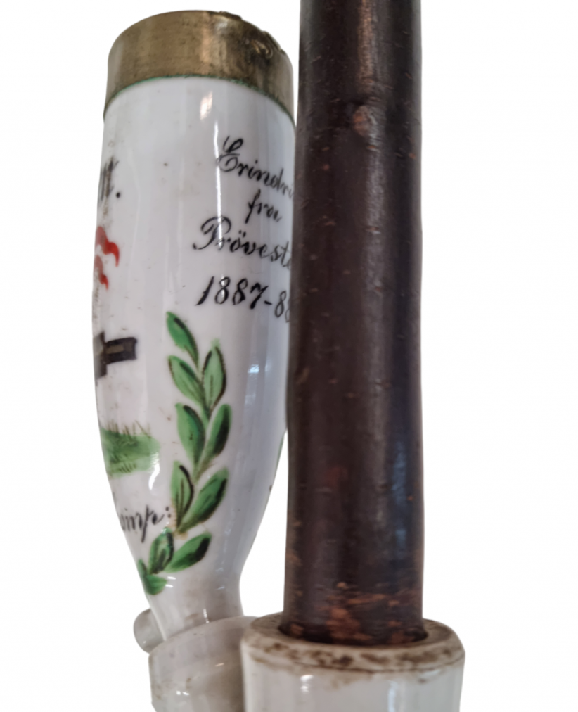 Fajfka z porcelánu, chybí záklopka, s keramickým nástavcem s malovaným motivem vojáka. Délka fajfky 124 cm, porcelán celkem 24 cm, šířka fajfky 2,5 cm.