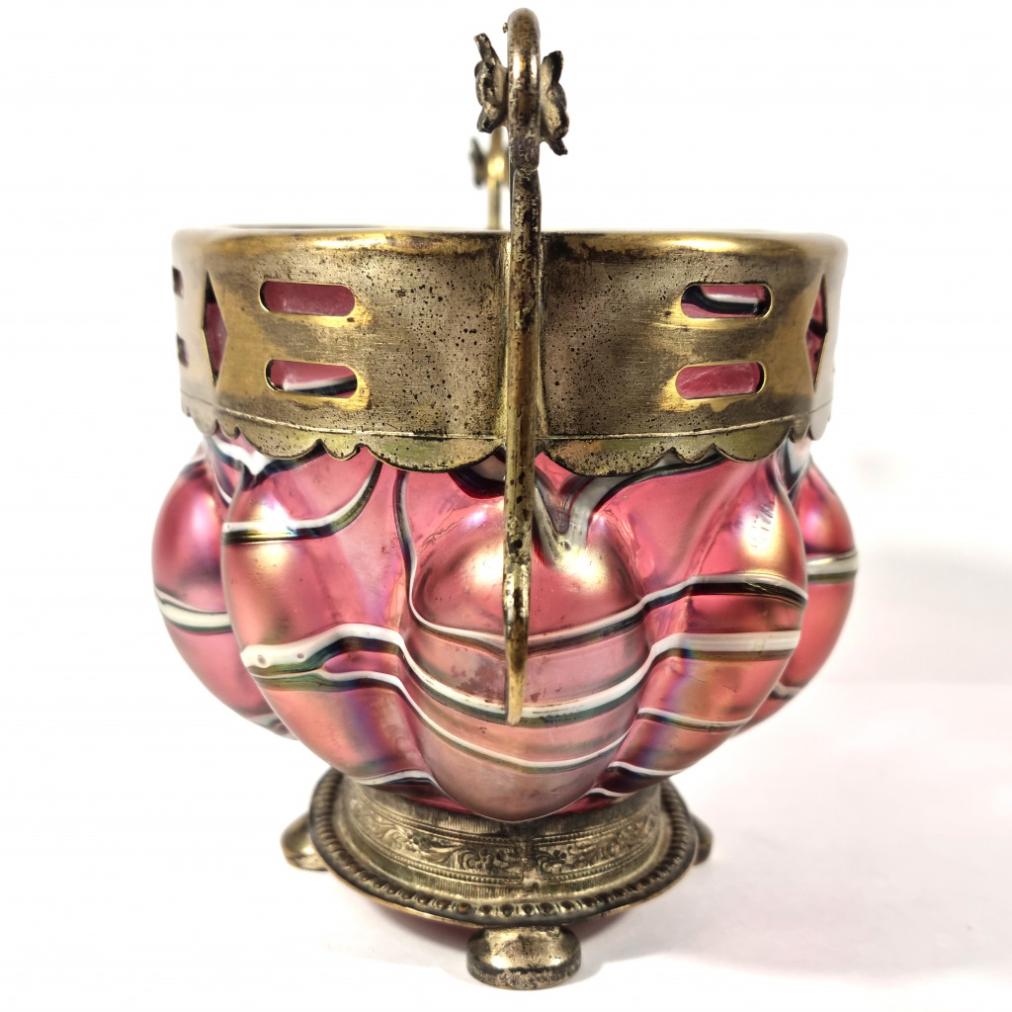 Sklárna Loetz Witwe , výška misky 11 cm + ouška, hloubka cca 10,5 cm. Sklo je v perfektním stavu, kovová montáž je zoxidovaná.