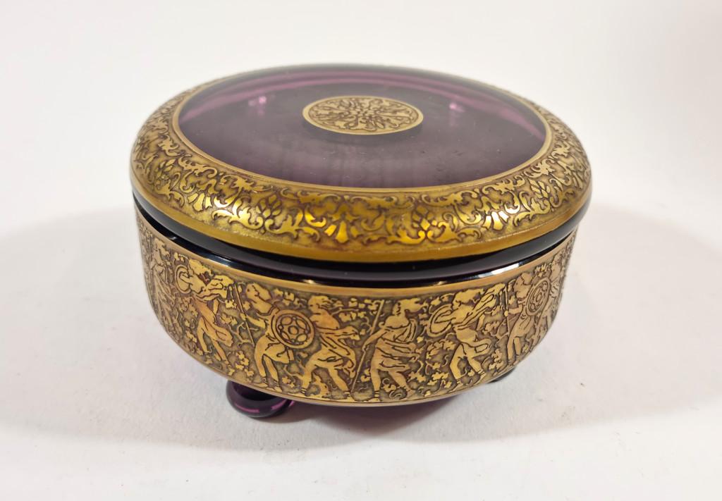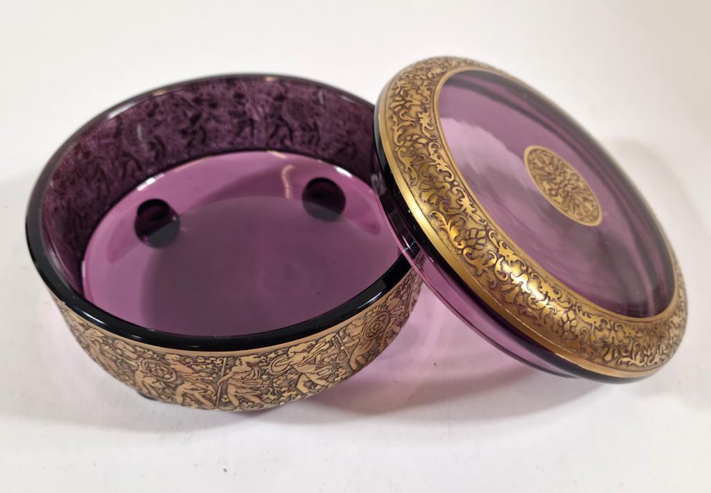 Kulatá dóza na čtyřech nožkách z fialového-ametystového skla,