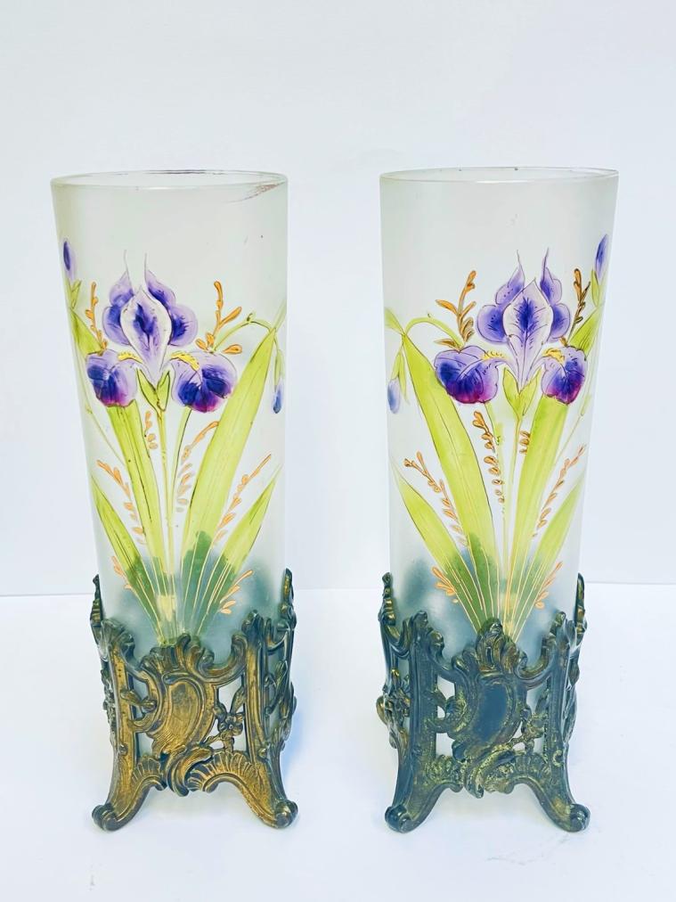 Skleněné vázy v kovové montáži, výška 24,5 cm, průměr podstavy 8 x 8 cm, průměr hrdla 8 cm, ručně malováno, neznačeno.