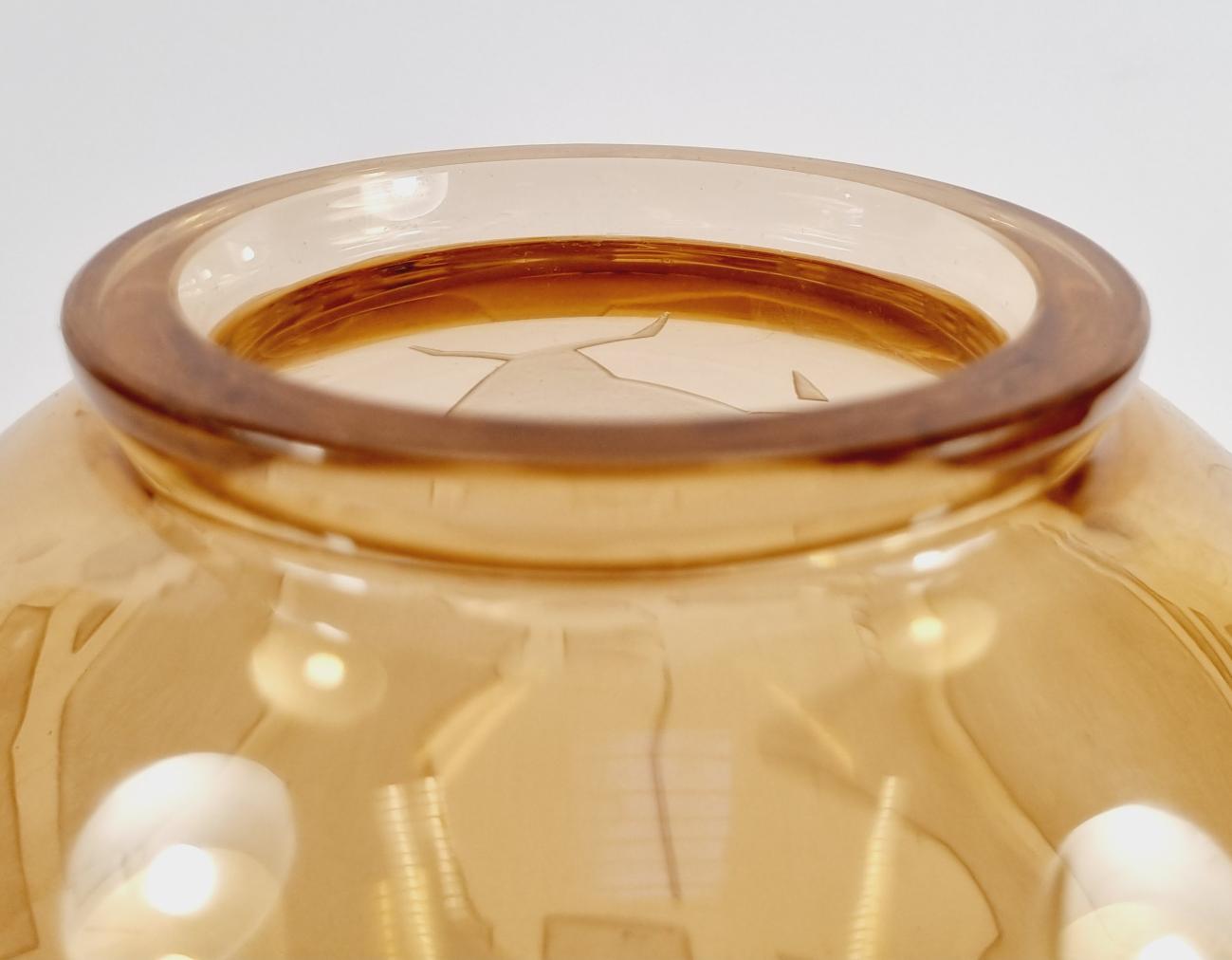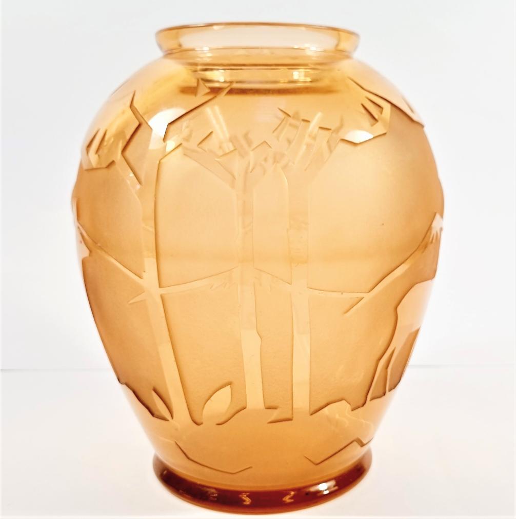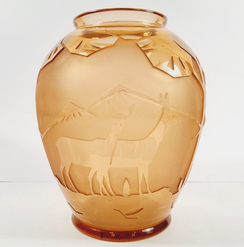 Skleněná váza, zvířecí dekor - srny. Výška 21 cm, šířka hrdla 9 cm. Váza nese známky mírného opotřebení.