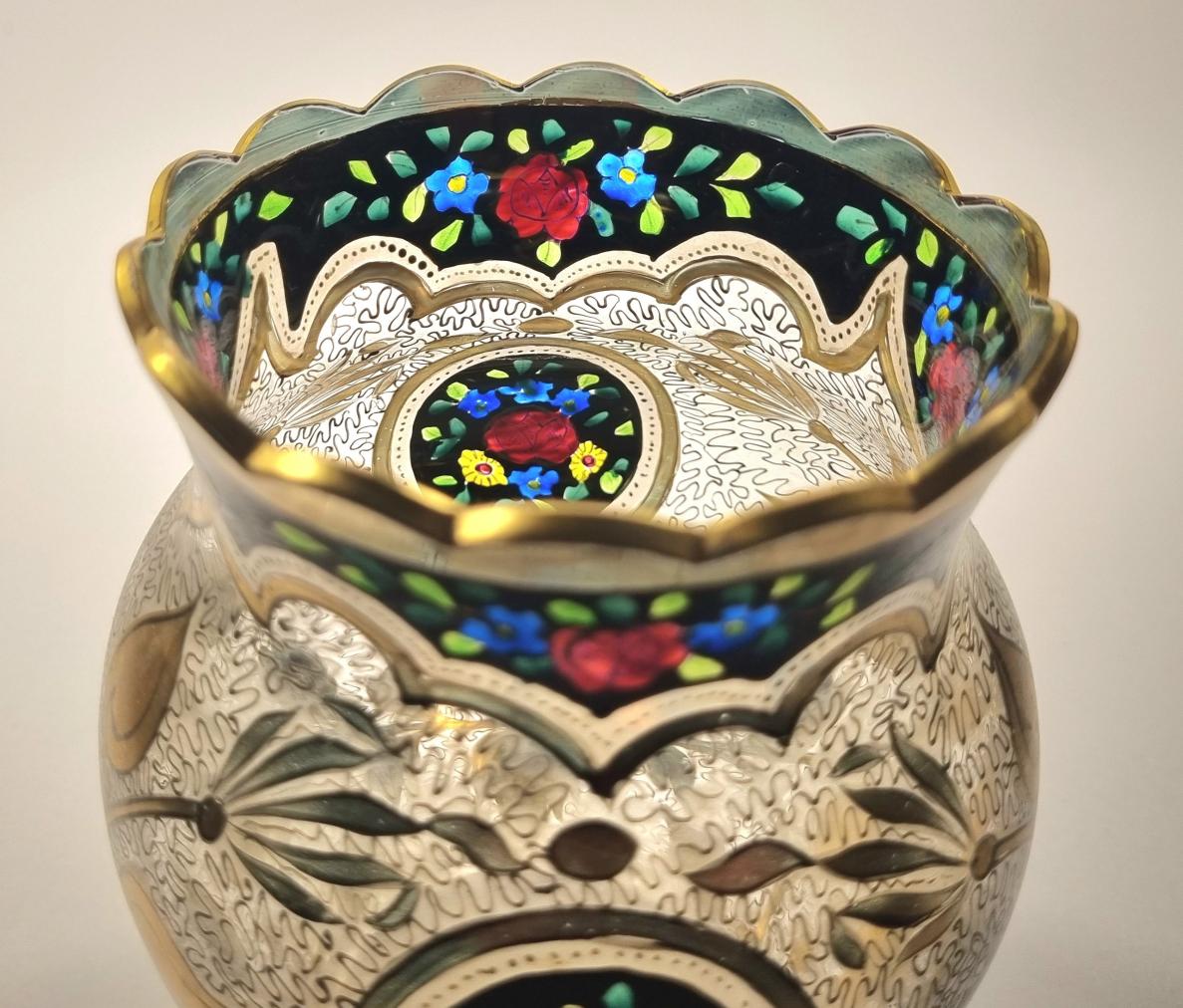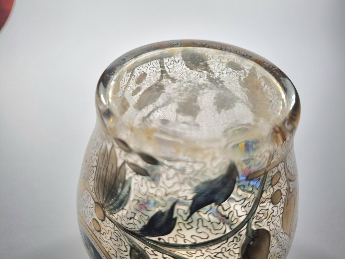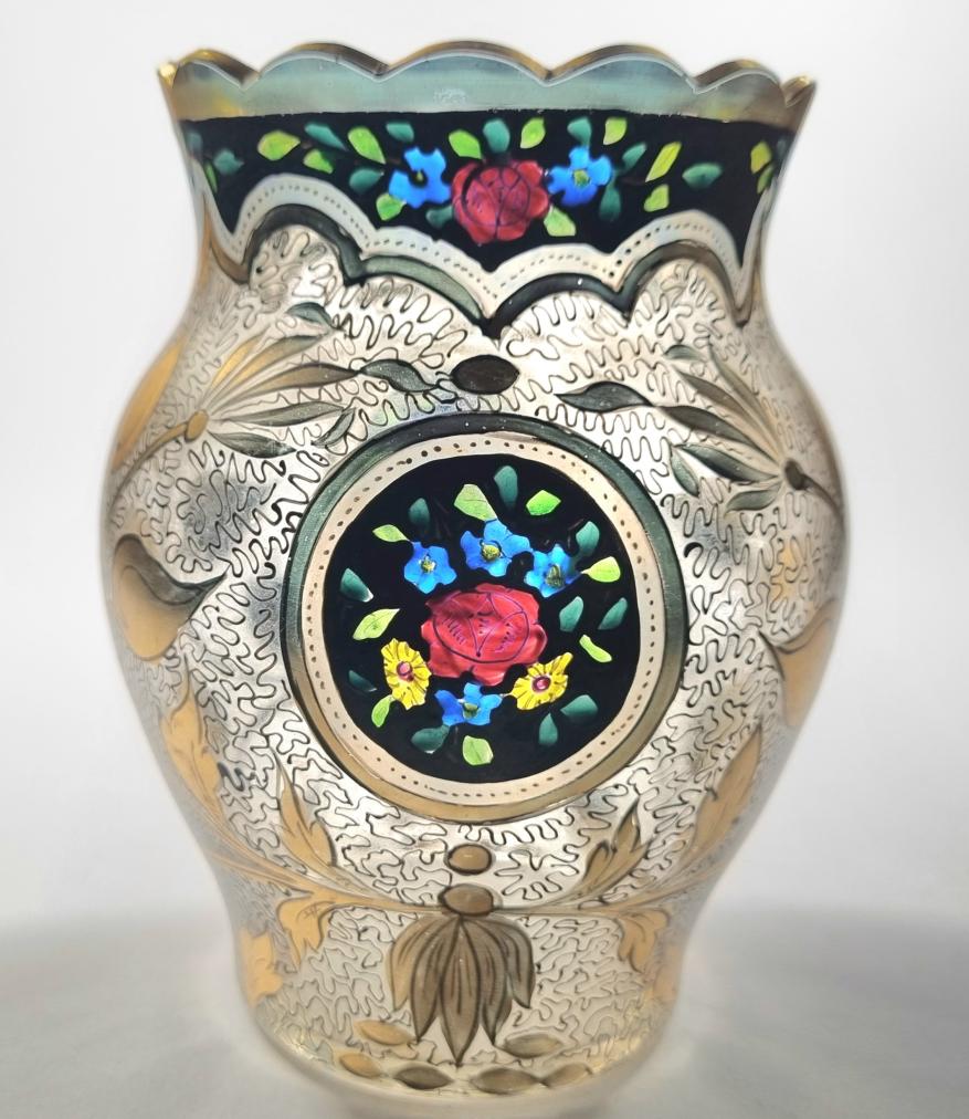 Ručně malovaná skleněná vázička o rozměrech: výška 14 cm, šířka 12 cm, průměr otvoru 9 cm.