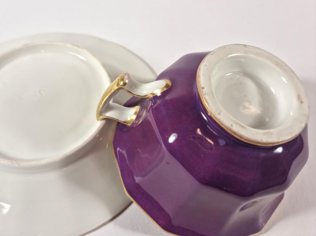 Šálek s podšálkem sytě fialové barvy, zlacení,