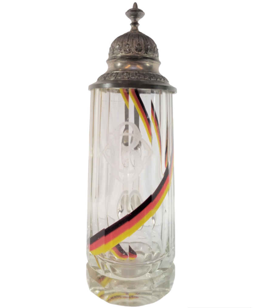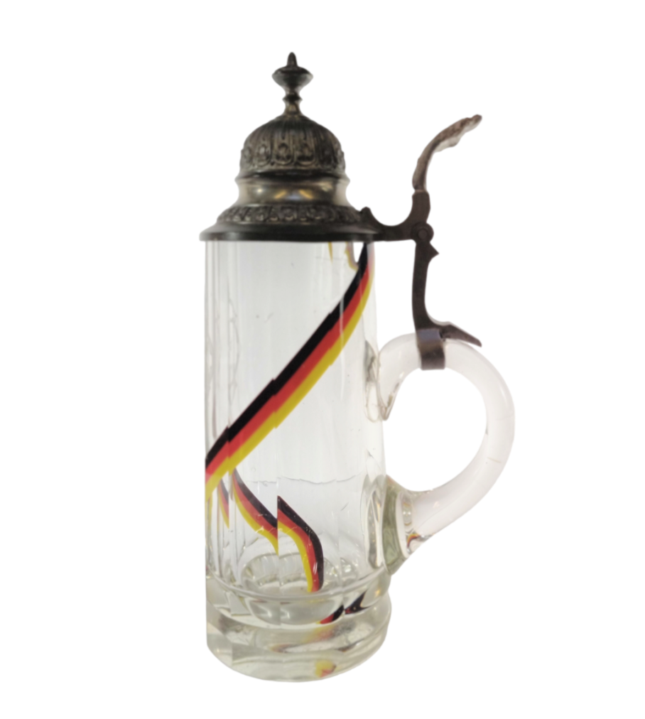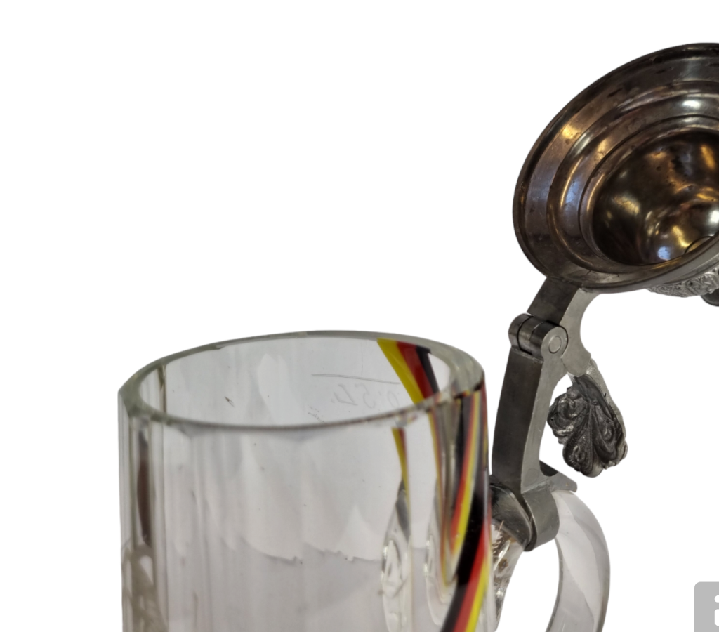 Skleněný půllitr s cínovým víkem. Výška skla 18 cm, včetně víka 26 cm. Perfektní stav, vybroušená ryska 0,5 l.