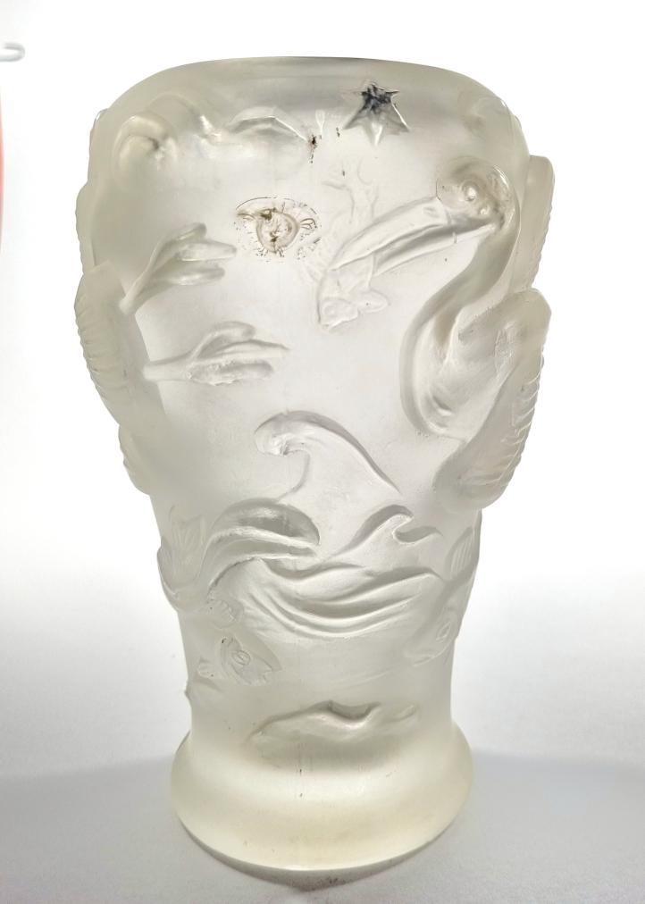 Skleněná váza o rozměrech: výška 19 cm, průměr dolní části 7,5 cm, průměr otvoru 5 cm.