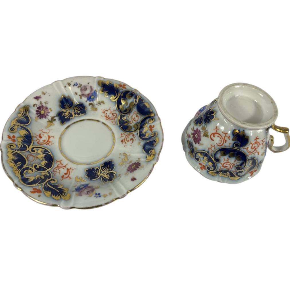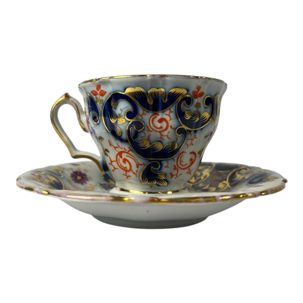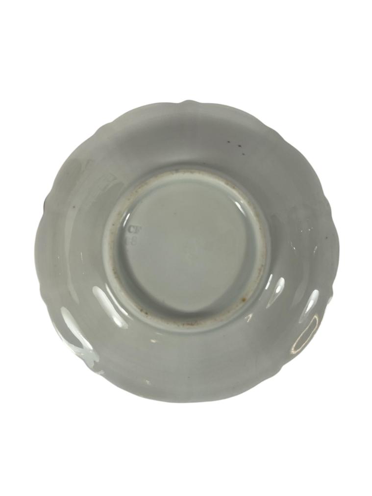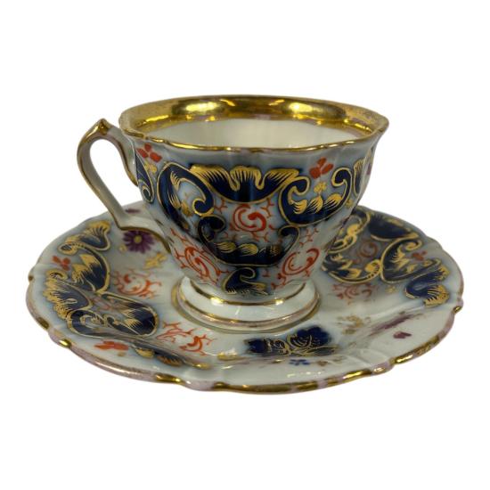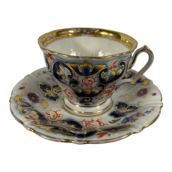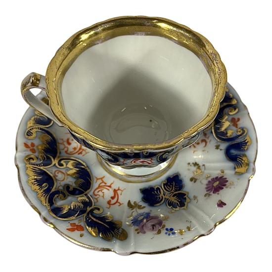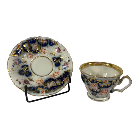 Elegantní šálek s podšálkem zdobí drobné barevné květy, dominantní jsou však listy a ornamenty v kobaltové barvě , které jsou zlatě rámovány. Okraje šálku i podšálku jsou rovněž zlaceny, barva zde je však již místy odřená. Odřené je rovněž zlacení na oušku. Výška šálku je 6,5 cm, šířka šálku je 10,5 cm, šířka podšálku je 15 cm. Podšálek je zespodu označen vtlačeným CF - Carl Fischer Březová z poloviny 19. století.