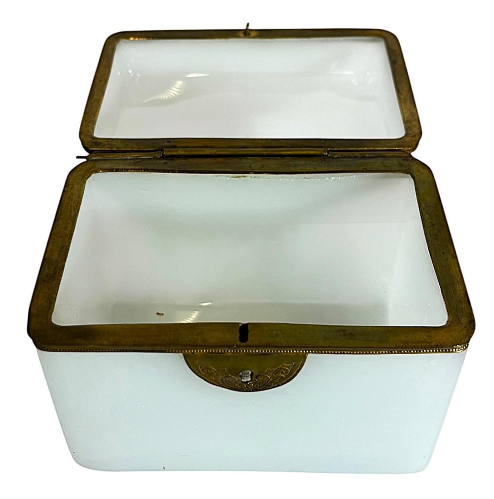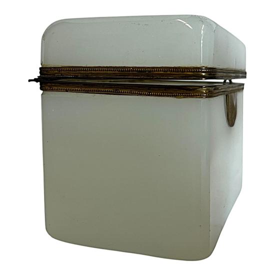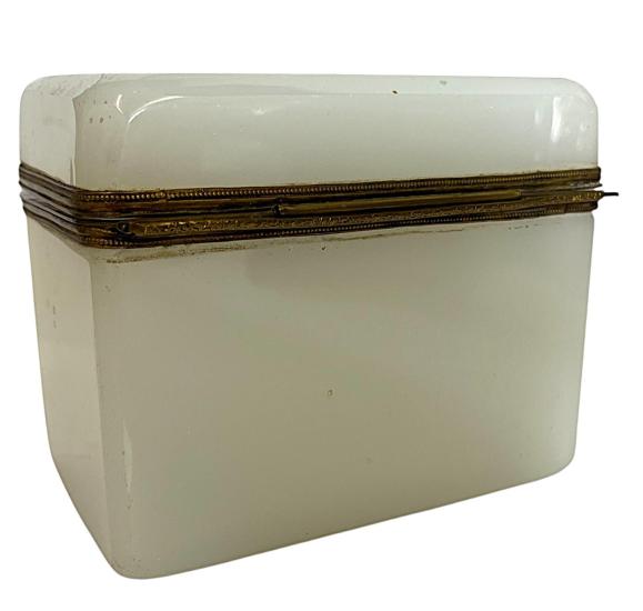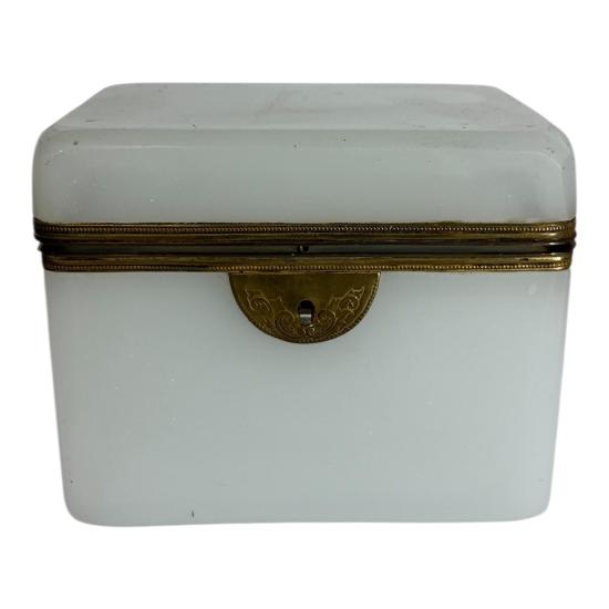 Krásná dóza z mléčného skla s kovovou konstrukcí. Celková výška 9 cm, rozměr 7 x 11,5 cm. K dózičce chybí klíč, jinak je ve skvělém stavu.