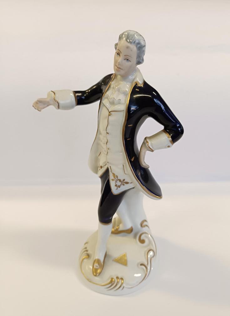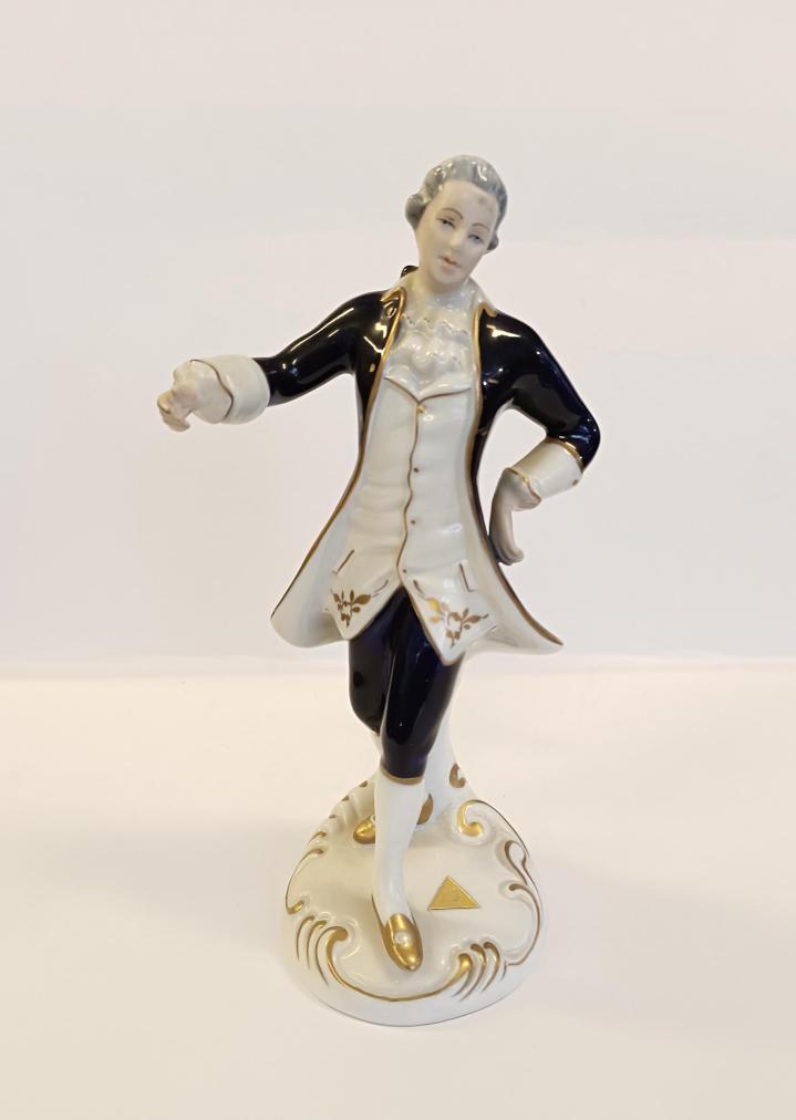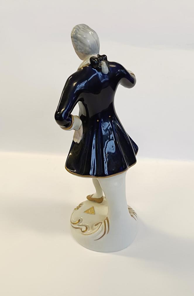 Porcelánová plastika tanečník v kobaltovém provedení se zlatými detaily. Značeno ,,Royal Dux". Soška je vysoká 23cm na podstavci o šířce 9cm. Nepoškozená.