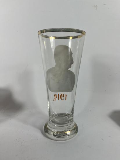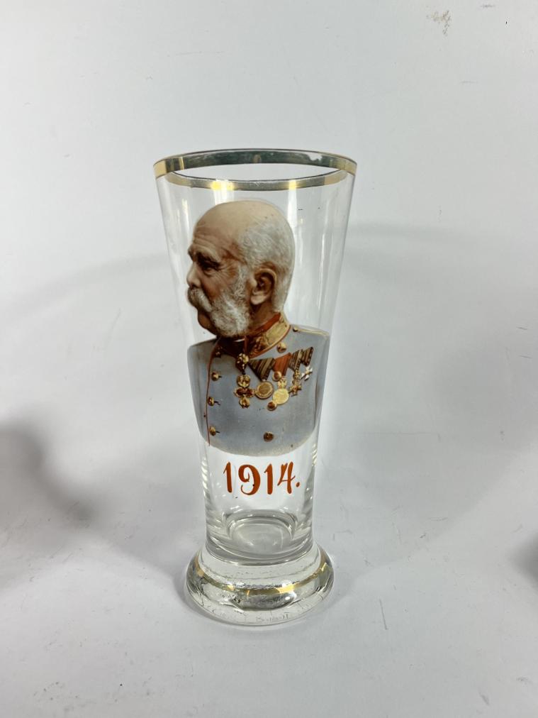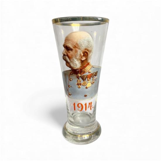 Starožitná sběratelská sklenice s podobiznou císaře Františka Josefa I. a malovaným letopočtem 1914. Sklenice má hrdlo lemované zlatou barvou, která je lehce setřená a na jednom místě chybí. Na výšku měří sklenice 20 cm, průměr hrdla je 8,5 cm, průměr podstavy je 7 cm. Podstava je mírně ošoupaná s několika škrábanci. Neznačeno.