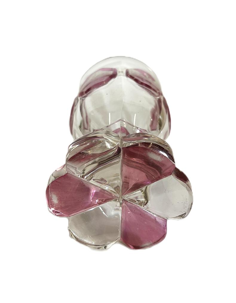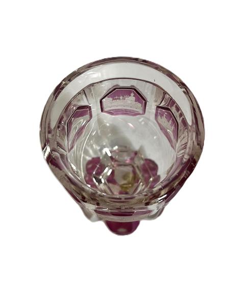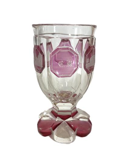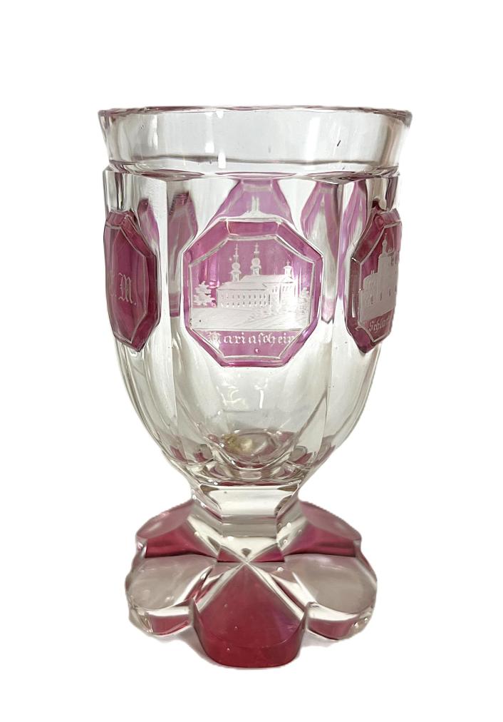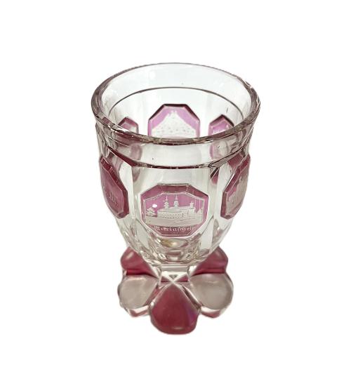 Krásný starožitný lázeňský pohárek s růžovými plochami a leptanými detaily. Plochy jsou velmi detailní a popsány zdobným písmem, stejně tak i jedna z plošek s iniciály E. M. Výška 12 cm, průměr 6,7 cm, podstava 6,7 cm. Perfektní stav, zespodu podstavy mírně ošoupaný růžový odstín - viz foto.