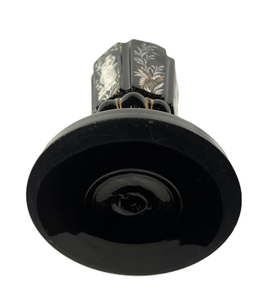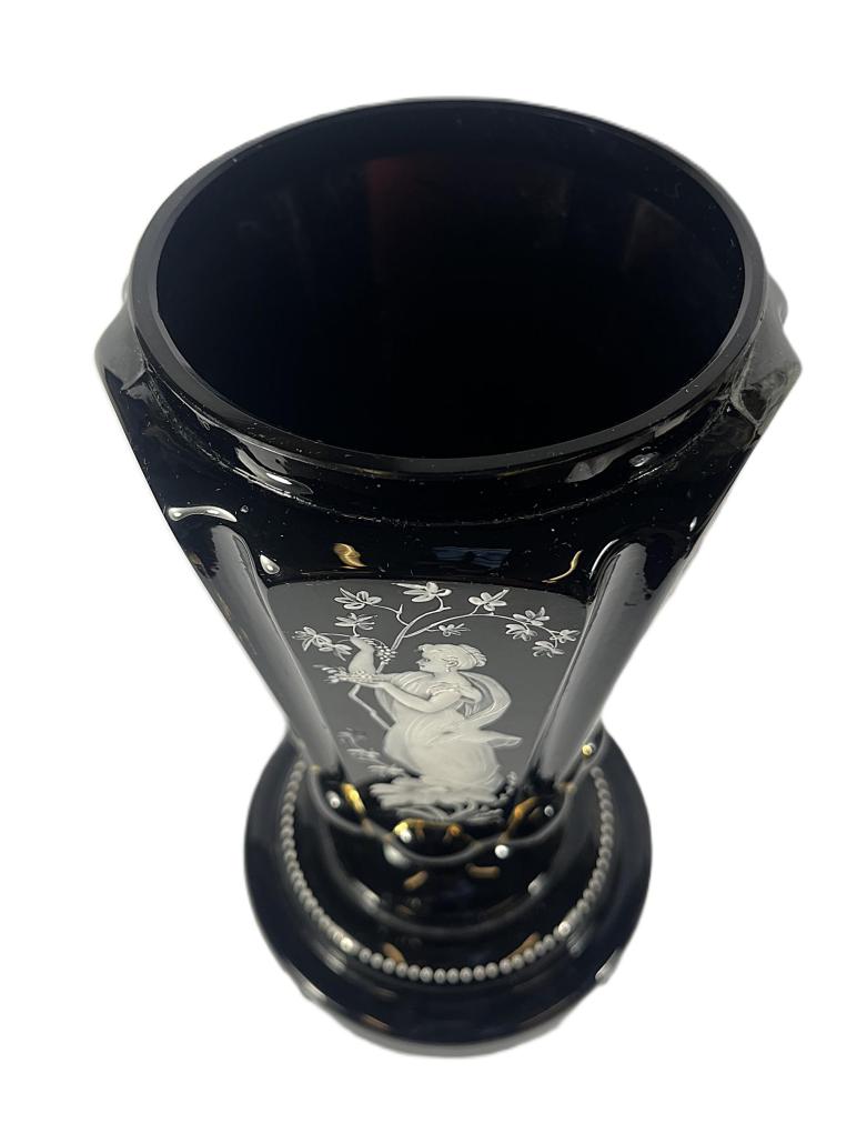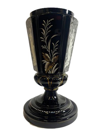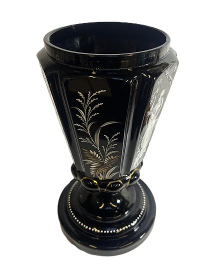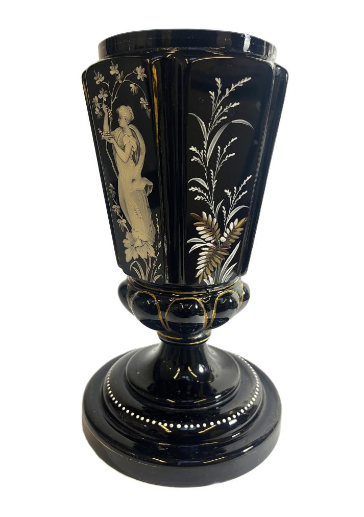 Starožitná váza z opakního, temně fialového skla, které působí skoro až černé. Ručně malovaná bílou barvou se zlatými detaily, na některých místech je zlatá barva ošoupaná nebo úplně chybí. Váza na výšku měří 27,5 cm, průměr hrdla je 11,5 cm. Průměr podstavy je 16,5 cm. Vnější hrana podstavy má drobné oťuky, jinak v dobrém stavu. Neznačeno.