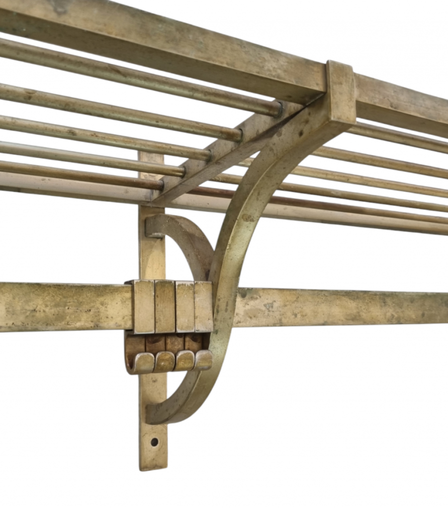 Kovový věšák na kabáty a klobouky je dlouhý 134 cm, maximální hloubka 32 cm. Je robustní a bez poškození.