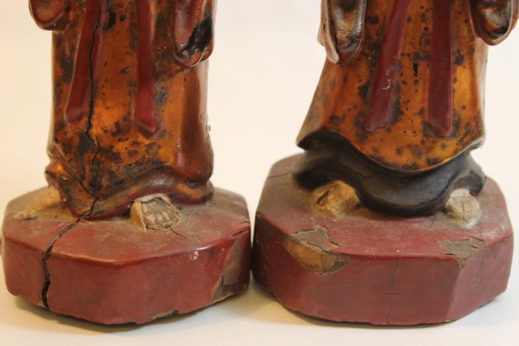 Dřevěné sošky, párové v původní polychromii jsou vysoké 27 cm, stav viz foto. Čína 2/2 19. století.